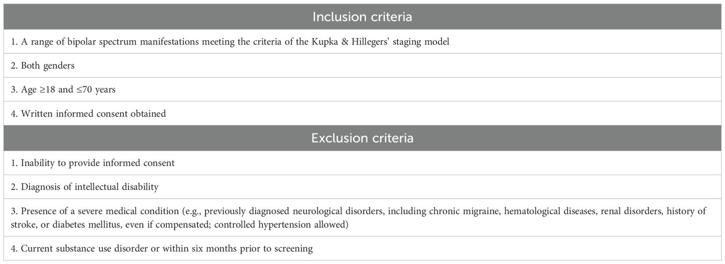 At baseline and at all subsequent time points, stages will be assigned according to the Kupka and Hillegers’ model, reported in Table 3 and herein summarized: stage 0 (increased risk, i.e., having a first-degree relative with BD, without psychiatric symptoms); stage 1 (presence of nonspecific psychiatric symptoms or depressive episode[s]); stage 2 (first mood episode meeting criteria for BD diagnosis); stage 3 (recurrent depressive, hypomanic, manic, or mixed episodes); and stage 4 (persistent, unremitting illness with chronic depressive, manic, or mixed episodes, including rapid cycling). In particular, for subjects classified as stage 1 according to the Kupka & Hillegers’ model, we referred to the specific operational criteria defined by Bechdolf et al. (45), described in Table 4.