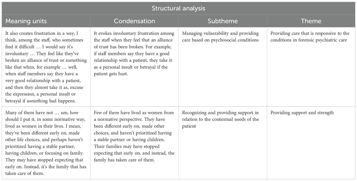 The interviews were transcribed verbatim, and the analysis was conducted in accordance with a method described by Lindseth and Norberg (23, 24). This analysis consists of three steps, the first step of which involves reading the assembled material several times to identify the prominent content. This is termed the naïve reading and is seen in the manuscript as the naïve understanding, describing the phenomenon of providing care to female patients in FPC as a whole. The structural analysis (second step) methodically explains the analyzed text in relation to the phenomenon. Meaning units, comprising several sentences, were condensed to smaller units (Table 1). These units were compared and analyzed for differences and similarities, resulting in 12 subthemes (Table 2). This step was conducted four times to ensure that the subthemes could stand alone while also being part of the whole text. Groups of subthemes were created, resulting in four themes (Table 2) and it was determined whether these themes reflected the naïve understanding formed in step one. The third and final step entails reading the material as a whole with an open mind and with the preunderstanding under control. The results were then examined in relation to the research question, the study’s context, and previous research (23), which is crucial for highlighting the results within a broader context. The first author performed an initial analysis, which was then validated by the second and fourth authors. This process was carried out manually without the use of software.