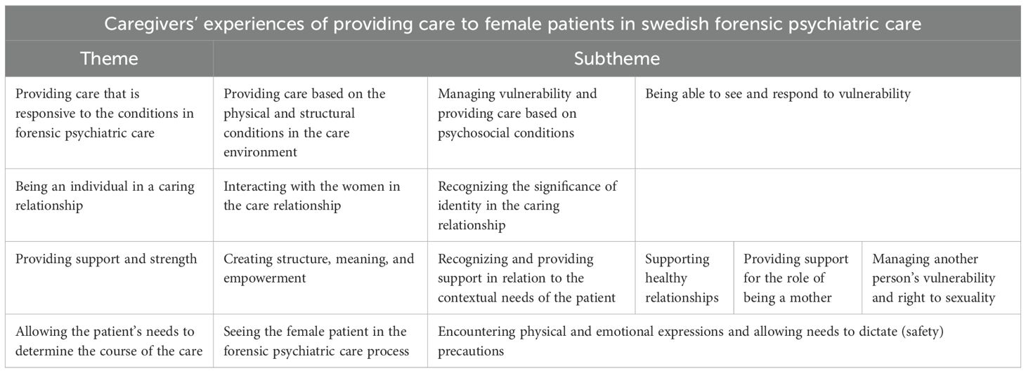 Female patients constitute a minority group in forensic psychiatry (3). The Swedish National Board of Health and Welfare reported that only 197 (13%) female patients received Forensic Psychiatric Care (FPC) in 2023, after having been sentenced to it by a court (5). People in Sweden who have been convicted of a crime may be subject to a forensic psychiatric assessment, which is conducted in pre-trial custody. If they are assessed as suffering from a severe mental disorder, they are still, according to the Swedish legal system, viewed as responsible for their criminal actions and can be sentenced to FPC, a legal sanction among others (6). The caregivers must follow the Health and Medical Services Act (2017:30) when providing care to the patients. However, FPC is also regulated by supplementary laws: The Compulsory Mental Care Act (1991:1128) and the Forensic Mental Care Act (1991:1129). Possible coercive measures are regulated in the first of these laws, and the use of different security levels to provide care for people suffering from severe mental disorders are emphasized in the second. FPC presents clinical, juridical, and ethical challenges for caregivers due to the fragility and vulnerability caused by the patients’ severe mental disorders (7). The patient group (both male and female) is vulnerable and faces precarious situations, partly due to their illness and the index crimes, and partly due to the institutional environment characterized by a high level of security where they are cared for against their will (8, 9). The wards are organized according to different security classifications: the very high security level (I) is equipped with a perimeter and structural protections capable of resisting escape attempts, including those involving assistance; the high security level (II) must be able to withstand escape attempts and the satisfactory security level (III) includes operational routines for monitoring patients’ whereabouts (10). Sollied and Kvande described that the environment with structure and predictability was proper and created an atmosphere beneficial for the patients’ disorders to become less prominent (7). Providing care for patients in such settings can be challenging, and it may take years of experience and practice to become an effective caregiver (3). The combination of the patients’ history of serious offending and complex psychopathology is demanding and requires caregivers to be highly skilled (2). Caregivers need to provide humanistic care, despite being aware of, yet not influenced by, the patients’ difficult life circumstances (8). The most common crimes committed by female patients were, according to the Swedish National Forensic Psychiatric Register (11), crimes against life and health. Previous research indicates that comorbidity is common and that female patients, when compared to male patients, seem to present a different psychopathological panorama with more depression, borderline personality disorder, and post-traumatic stress disorder but less antisocial personality disorder (4). They also seem to have a complex history of victimization with higher rates of sexual abuse, more self-harm and suicidality, and their offenses are more often directed towards family and children (4). The women seemed to exhibit a behavior where they claimed to be pregnant, were seriously ill, or falsely accused male patients or caregivers of harassment, which was less common among male patients (ibid).
