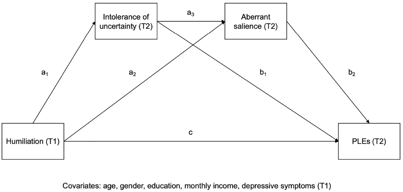 Given its role in psychosis models, AS may represent the pathway through which elevated IU contributes to PLE development. This proposed sequence—where IU heightens vulnerability to AS-related processing differences—warrants direct empirical testing. The present study examines this possibility by modeling the relationships among humiliation, IU, AS, and PLEs in a single framework. Using serial mediation analysis in a non-clinical sample of young adults, we hypothesize that IU and AS function as mediators linking humiliation to PLEs.