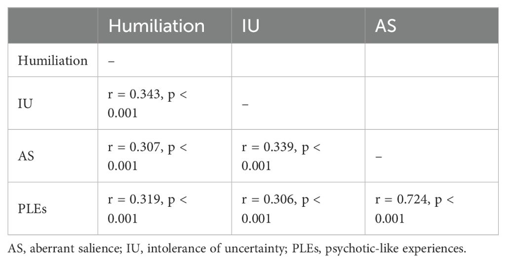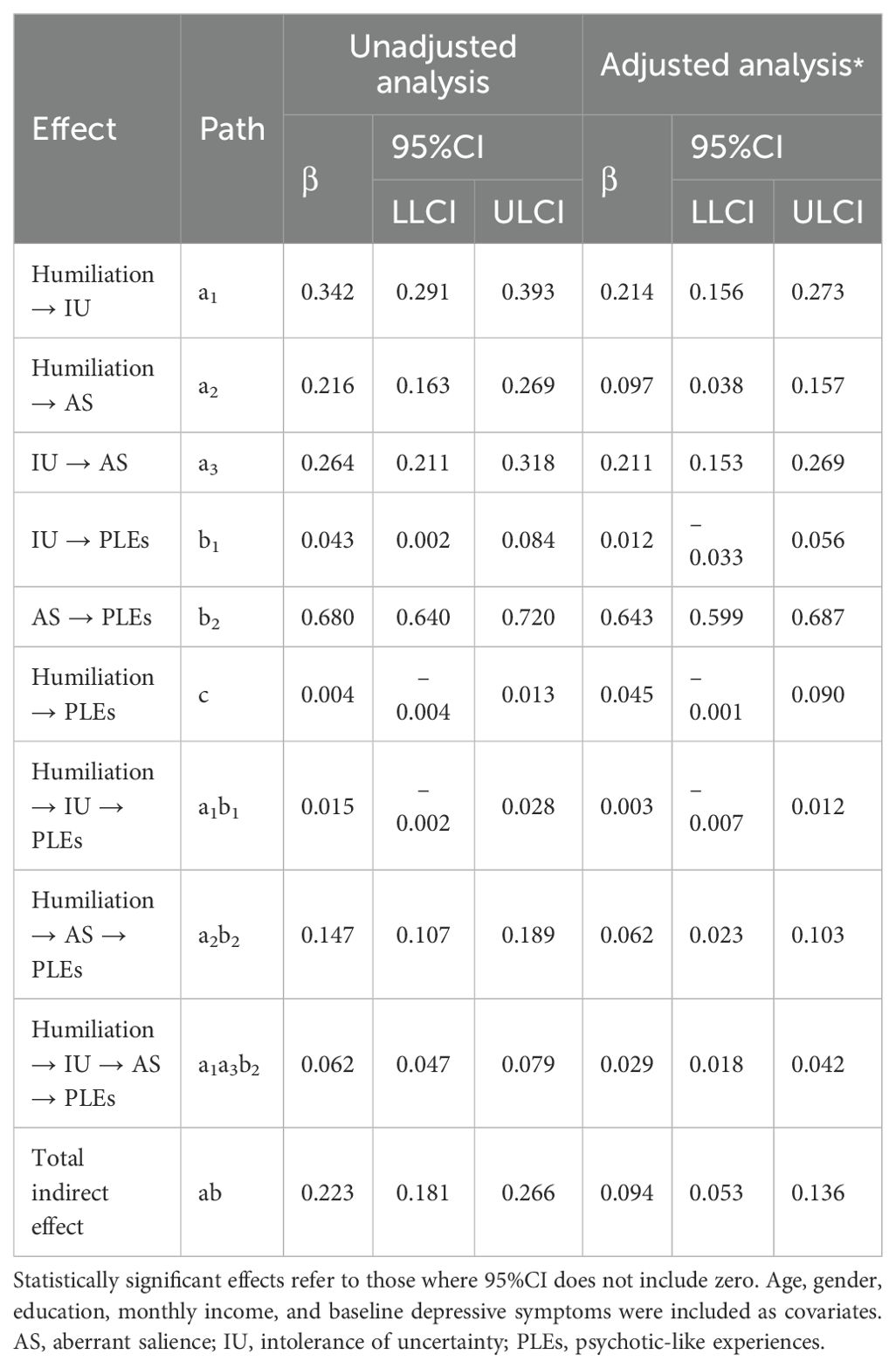Results: Humiliation was not directly associated with the level of follow-up PLEs. However, two mediation paths linking humiliation and PLEs were statistically significant after adjustment for age, gender, education, monthly income, and baseline depressive symptoms. The first one led through AS (without a mediating effect of IU) and the second one led through IU and AS (a serial mediation). The indirect association of humiliation with PLEs through a mediating effect of IU (i.e., without AS) was not statistically significant.