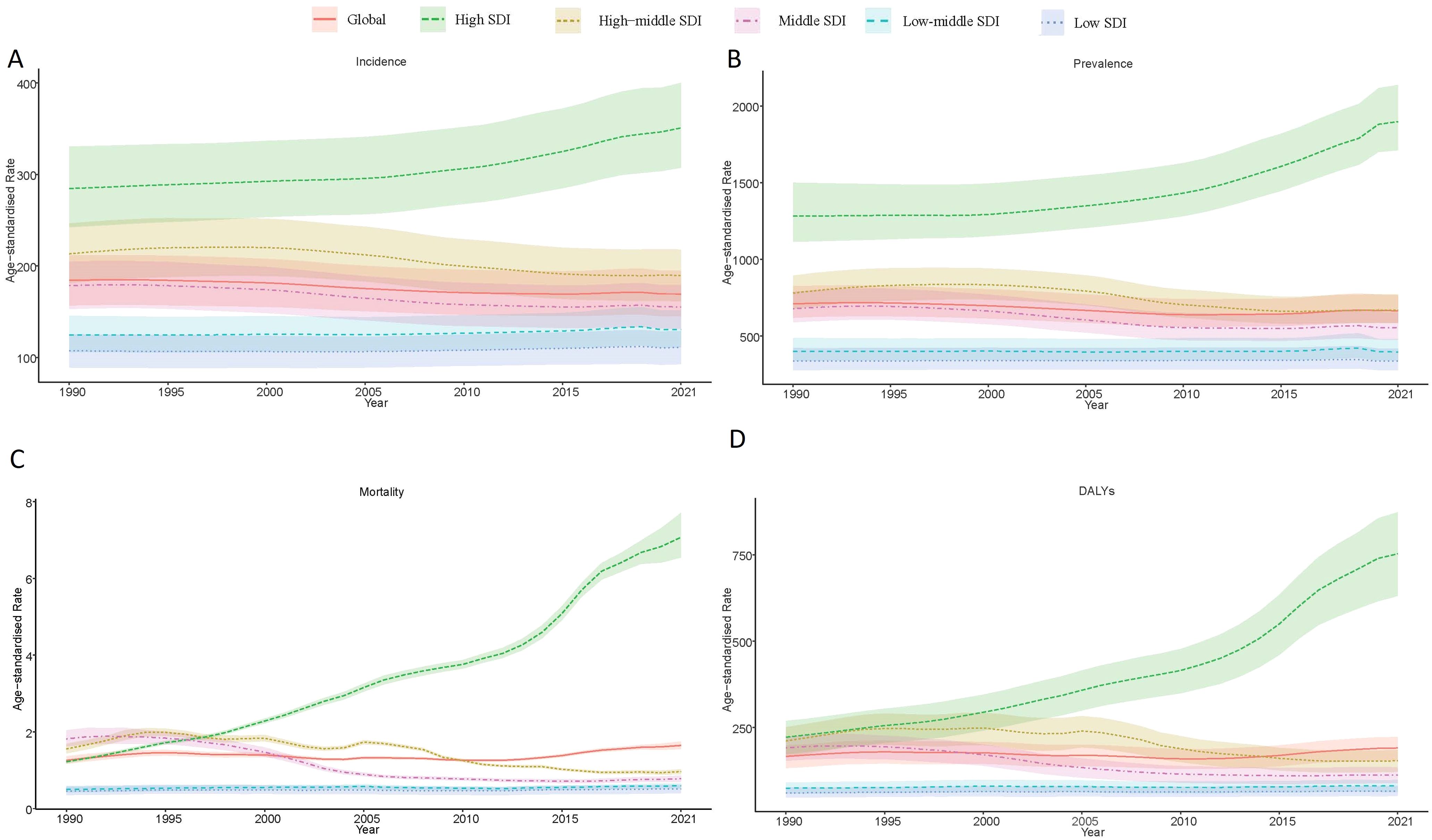 This study utilized data from the Global Burden of Diseases, Injuries, and Risk Factors Study (GBD) 2021, accessed through the Global Health Data Exchange (GHDx) query tool, to analyze the global burden of DUDs from 1990 to 2021 (Institute for Health Metrics and Evaluation, 2024). The dataset included estimates of incidence, prevalence, mortality, and DALYs, stratified by age, sex, country, and region. The Socio-demographic Index (SDI), developed by the GBD collaboration, integrates lag-distributed income per capita, average educational attainment (ages 15+), and total fertility rate. SDI values (range: 0–1) were obtained directly from GHDx. Countries were stratified into SDI quintiles (low: <0.45; lower-middle: 0.45–0.61; middle: 0.61–0.69; high-middle: 0.69–0.81; high: >0.81), consistent with GBD 2021 protocols. Socioeconomic influences were assessed using the SDI to facilitate cross-national comparisons of development and healthcare system performance.