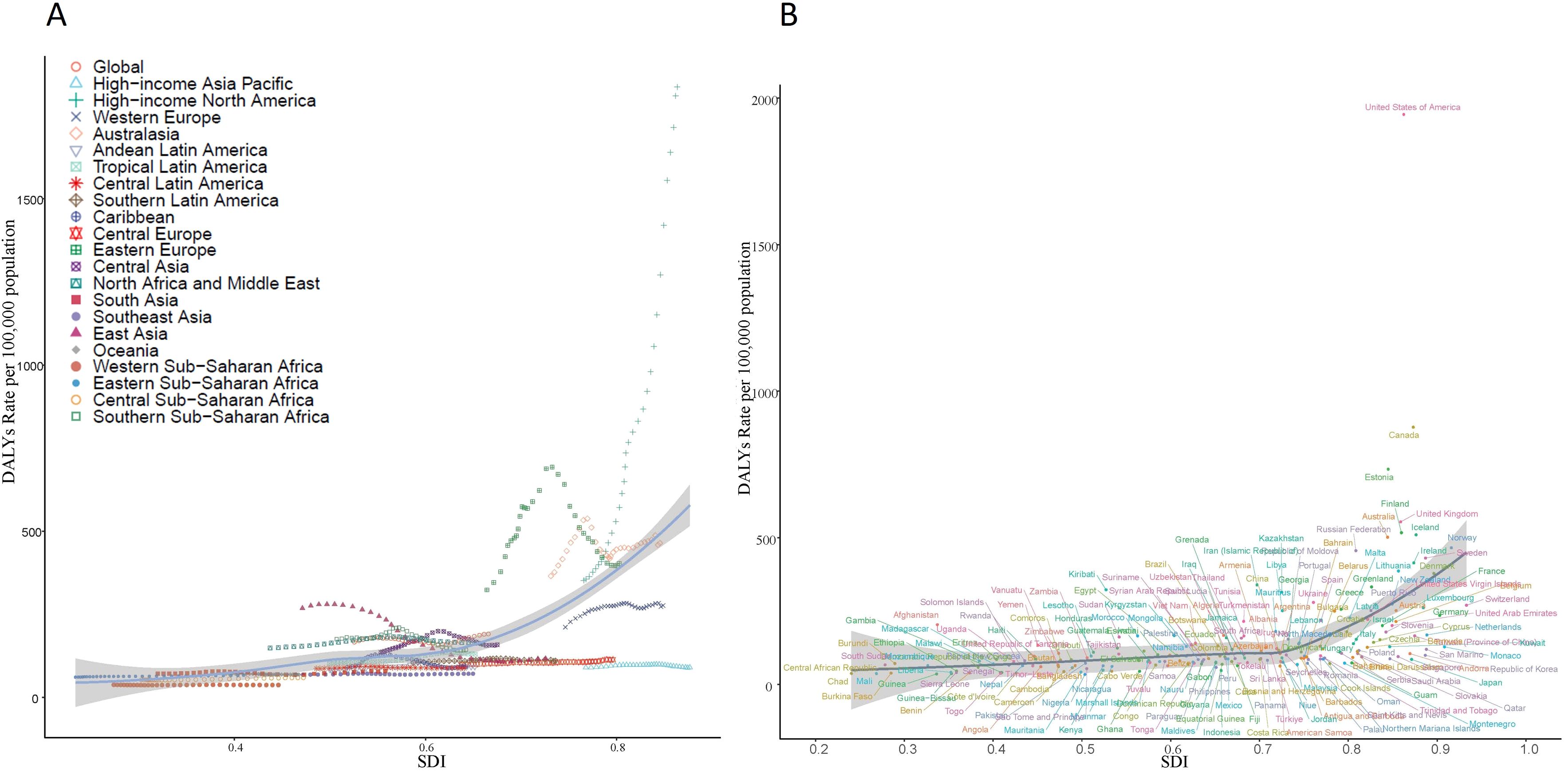 Figure 4. The relationship between age-standardized rate and sociodemographic index (SDI) of Drug Use Disorders (DUD) in 2021. (A) The relationship between SDI and age-standardized DALYs in 21 GBD regions in 2021. (B) The relationship between SDI and age-standardized DALYs in 204 countries in 2021.