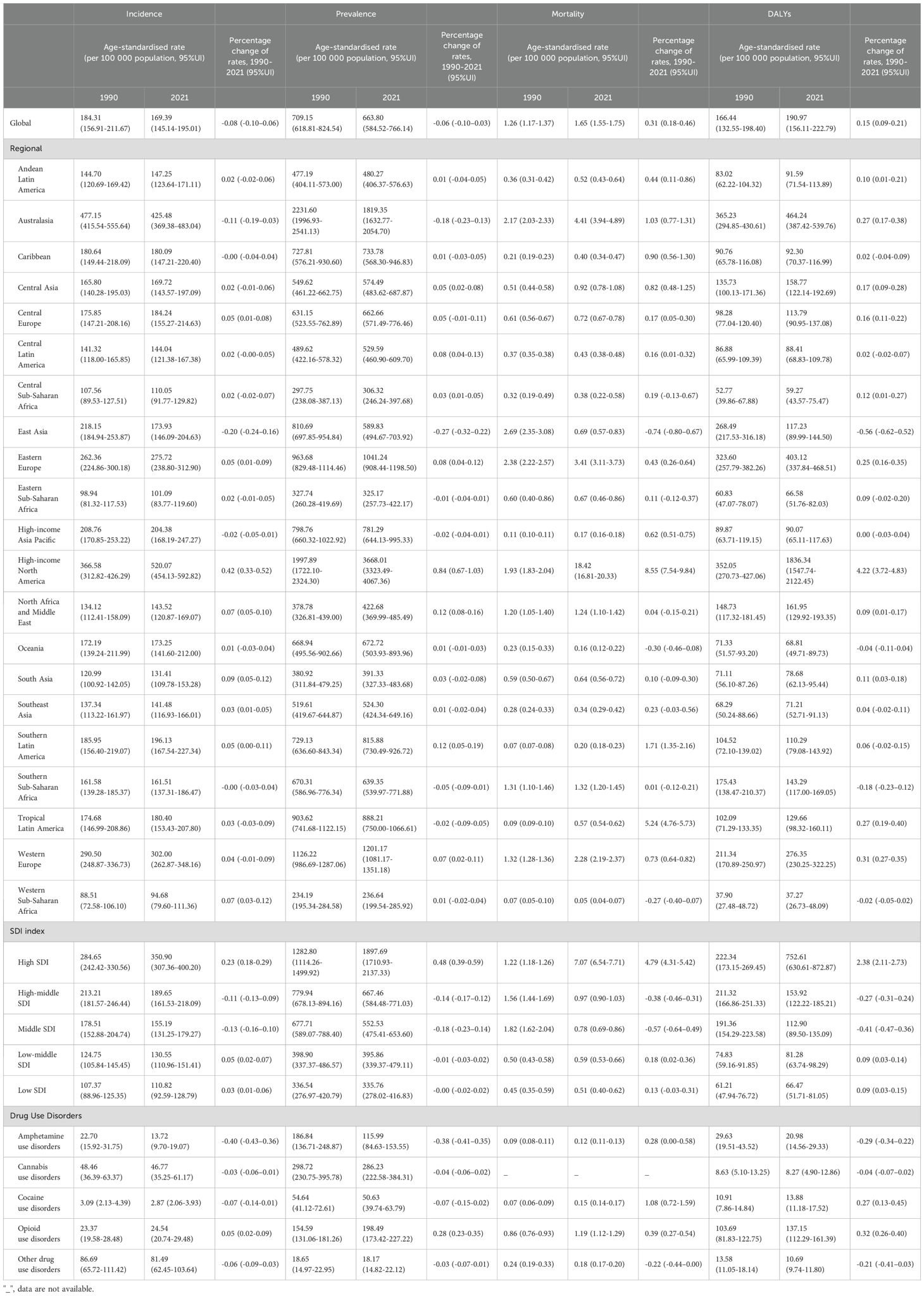 Table 1. Global and regional level burden of drug use disorders stratified by incidence, prevalence, mortality and DALYs, 1990-2021.