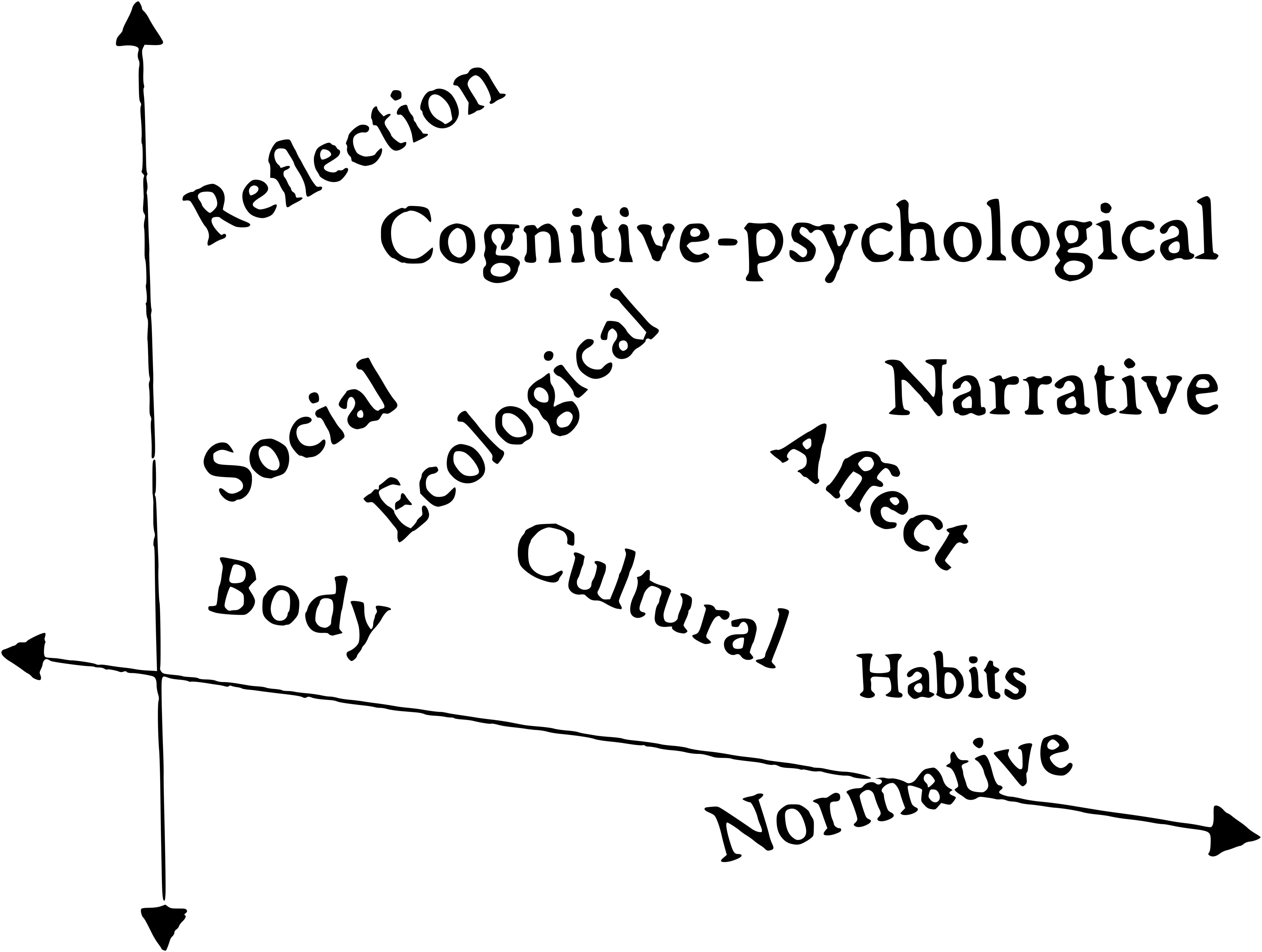 Nevertheless, despite this nuanced multidirectionality, what remains strikingly absent is depth, which goes beyond a mere structural ordering towards a temporal unfolding and the genesis of the pattern. Depth, in our view, refers to the generative structuring and sedimentation of experience, introducing a third—intrinsically temporal—dimension to the figure that can account for the relation of transcendental foundation between layers (for example, the body schema has to be grounded to allow narratives to be coherent). That is the genetic production of what we will call an architectonics. Without examining the processes of passive synthesis and sedimentation—which is the project of the so-called genetic and generative phenomenology8—the self-pattern remains largely formal despite its dynamics, and its architecture resembles a flattened plane of interactions that are entangled without any genetic relief. Gallagher seems to be aware of the problem; however, he dismisses the idea of a diachronic constitution that operates with levels (6, 54). Although the PTS does work with the idea of different time-scales (6, 55), these scales remain comparable on a Cartesian plane.