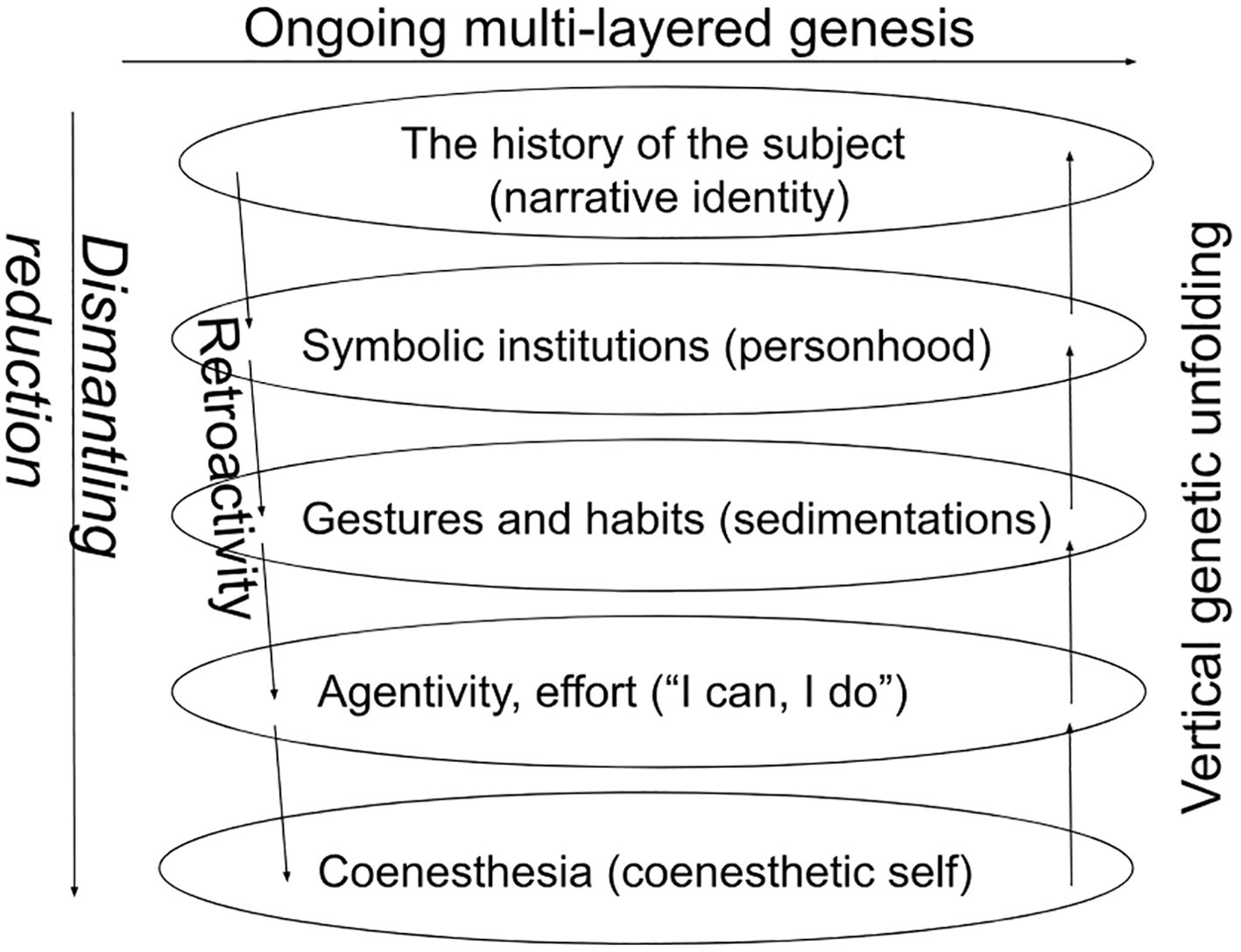 The dismantling reduction does not however uncover real entities that can be found somewhere (in the brain for example), but only layers of self-experience which will depend on the concrete analyses which are carried out. As an example, this has been done for describing the layering of self-narration in BPD (59–61), imaginative experience in SSDs (62) or the genesis of basic trust in early childhood (63). The architectonic model reintroduces the idea of foundational layers, while renouncing the idea of a static eidetic reduction. Instead of an essentialist (eidetic) reduction, the dismantling reduction uncovers interdependent layers, layers that function simultaneously, although they build one on the other genetically. While the genetic unfolding is bottom-up, the simultaneous polyrhythmic functioning allows for top-down effects, constituting a multi-layered dynamic pattern.