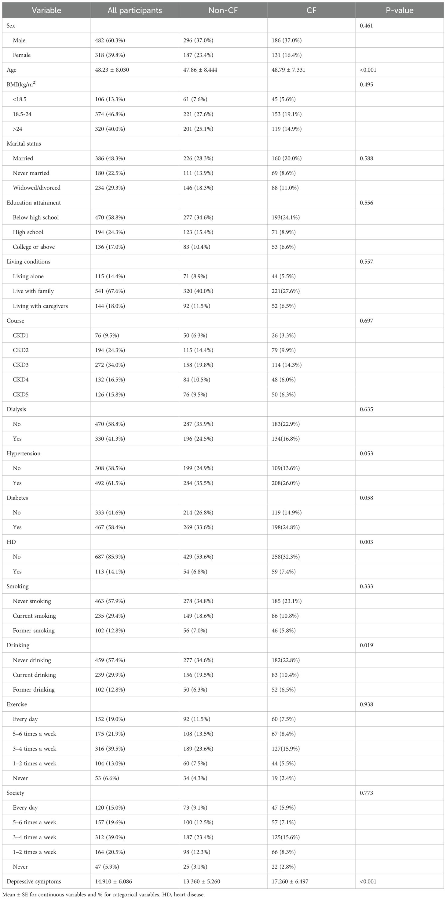 The basic characteristics of 800 participants, of whom 317 (39.6%) have CF. The average CES-D score of our population is 14.91. Among all the participants, 482 (60.3%) were male, with an average age of 48.23 years, and 470 (58.8%) had a below high school education. Compared with participants without CF participants with CF have higher CES-D scores. There are differences in CF between CKD patients with HD and those without HD, and the difference between drinking and CF in lifestyle characteristics is statistically significant. (See Table 1 for details.)