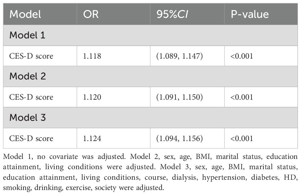 Conclusion: Depressive symptoms are significantly associated with CF in CKD patients. Routine CES-D screening and provision of psychological support for patients scoring ≥12 may mitigate CF risk.