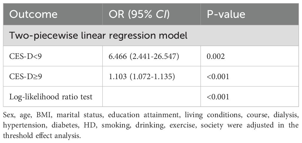 The dose-response curve derived from restricted cubic spline analysis further corroborates the non-linear association, demonstrating a steeper slope in CF risk elevation below the CES-D threshold of 9 compared to the gradual increase observed beyond this inflection point. This pattern persists even after comprehensive adjustment for sociodemographic factors (age, marital status, education), lifestyle variables (smoking, alcohol consumption, exercise frequency), and clinical characteristics (dialysis status, hypertension control, diabetes management). The consistency across analytical approaches—from crude models to fully adjusted threshold regression—strengthens the robustness of our findings.