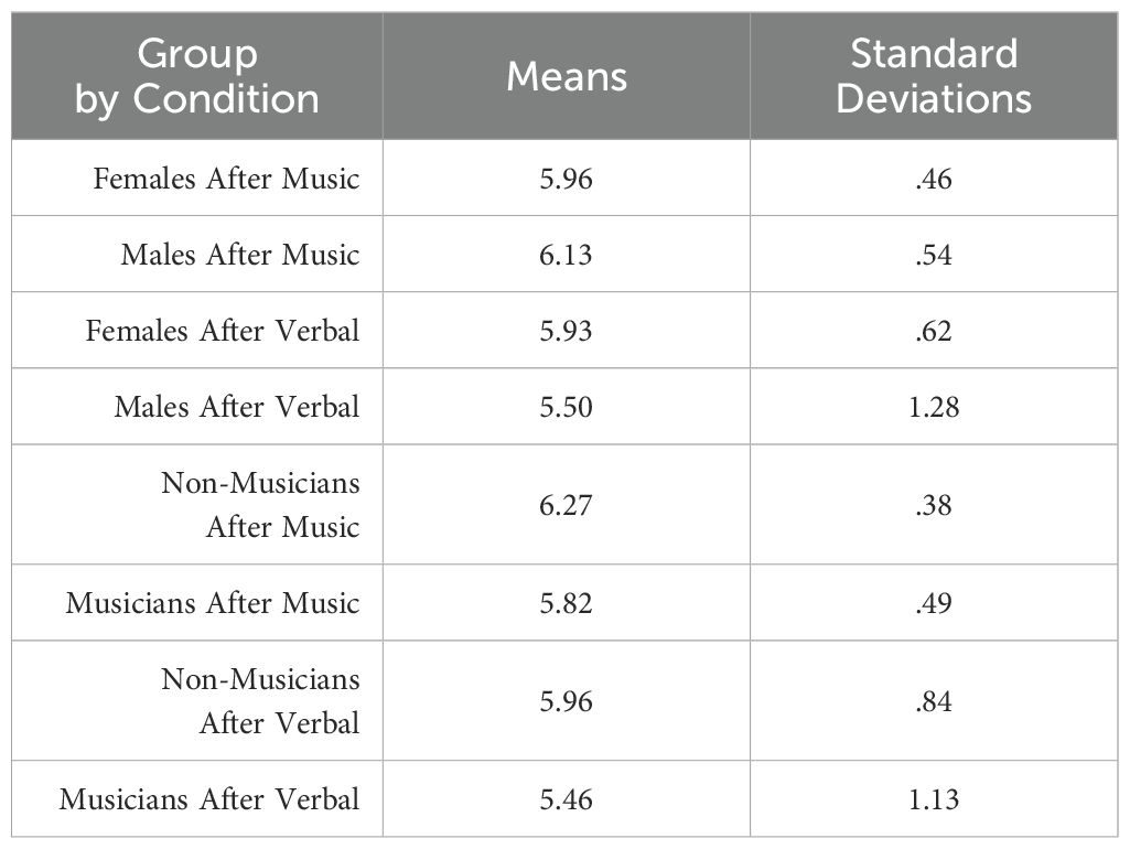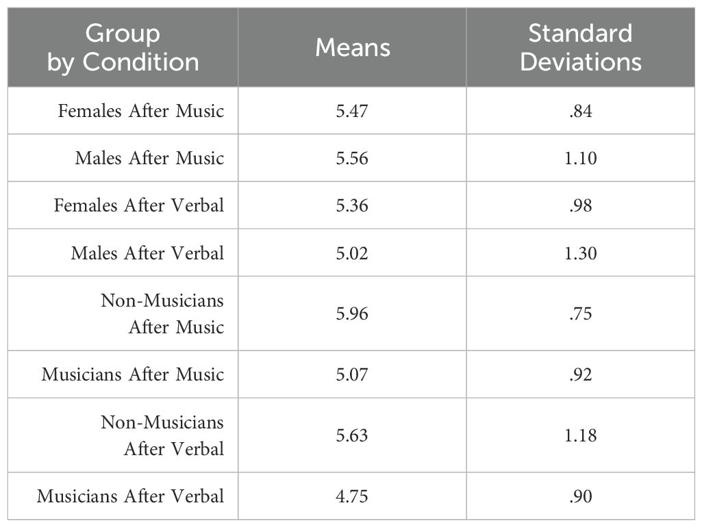 Of the eight participants who consented to participate in the study, all of them completed all study requirements including the interventions, questionnaires, and interview for a total completion rate of 100%. Completion of the full protocol lasted two hours 23 minutes for non-musicians and two hours two minutes for musicians. The onset of data collection began at approximately the same time of day for each group, 4p.m. for non-musicians and 5p.m. for musicians.