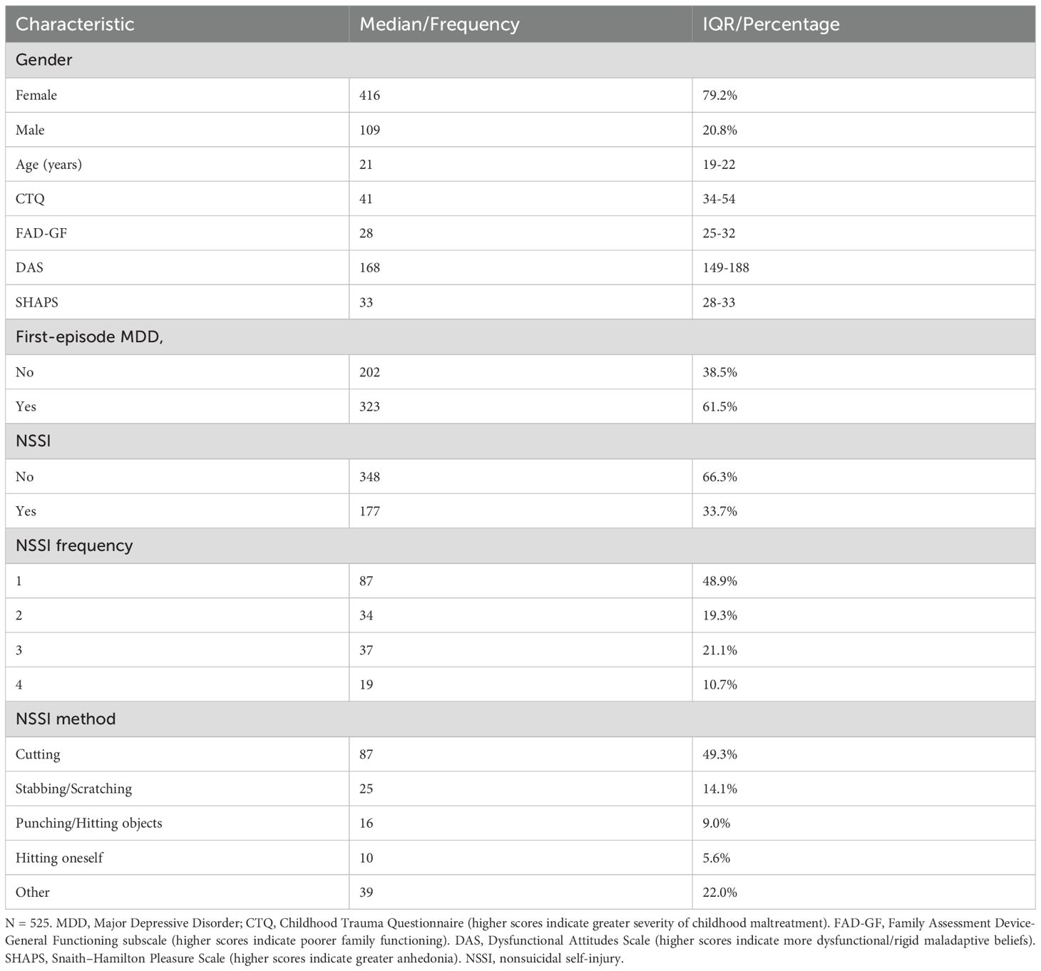 Table 1 summarizes the demographic and clinical characteristics of the participants (n = 525). The sample consisted of 416 females (79.2%) and 109 males (20.8%), with a median age of 21 years (interquartile range, IQR = 19–22). A total of 61.5% of participants were experiencing their first episode of MDD. With respect to nonsuicidal self-injury (NSSI), 33.7% (n = 177) of participants reported a history of self-injury. Among these, nearly half (48.9%) engaged in NSSI at least once in the past year, followed by those who did so three times (21.1%), twice (19.3%), and four or more times (10.7%). Cutting was the most frequently reported method (49.3%), followed by stabbing/scratching (14.1%), punching/hitting objects (9.0%), hitting oneself (5.6%), and other methods (22.0%). Detailed demographic and clinical characteristics are presented in Table 1.