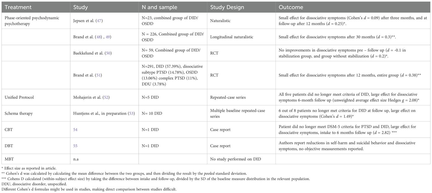 CBT for DID builds on the proven effectiveness of intensive trauma treatment for disorders resulting from interpersonal trauma in childhood. Voorendonk et al. (70) showed in a non-randomized study the effectiveness of an intensive 8-day treatment consisting of a combination of exposure, EMDR therapy, psychoeducation and physical activity, for complex PTSD. Both PTSD and complex PTSD decreased significantly during treatment in 308 patients diagnosed with PTSD. This resulted in a significant loss of PTSD (74.0%) and complex PTSD diagnoses (85.0%) No side effects occurred in terms of suicides, suicide attempts, or hospitalizations. No RCTs have yet been conducted on the application of this intervention in the DID/OSDD patient group. In a case study, 54) describe the application of CBT for DID. Treatment outcomes were measured at intake, before treatment, after treatment, and at 3 and 6 months of follow-up. After treatment, patient no longer met DSM-5 diagnostic criteria for neither PTSD nor DID. These outcomes were maintained at follow-up as large effects were found for dissociative symptoms at 6 months follow up (Cohens d = 2.82).