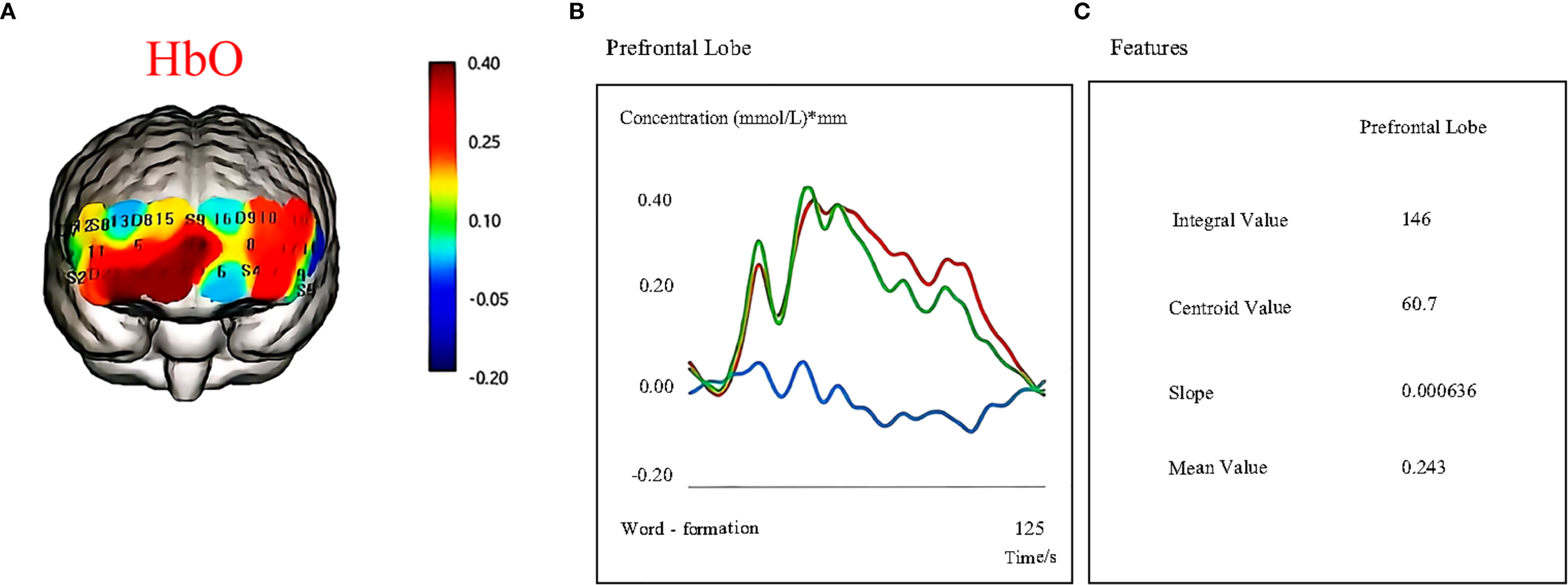 Cortical activation during cognitive task performance as measured by fNIRS. (A) Oxygenated hemoglobin (HbO) changes. (B) Hemodynamic responses (HbO, HbR, HbT) in the prefrontal cortex during task execution. (C) Quantitative features extracted from fNIRS signals, including the integral value, centroid value, slope, and mean value.