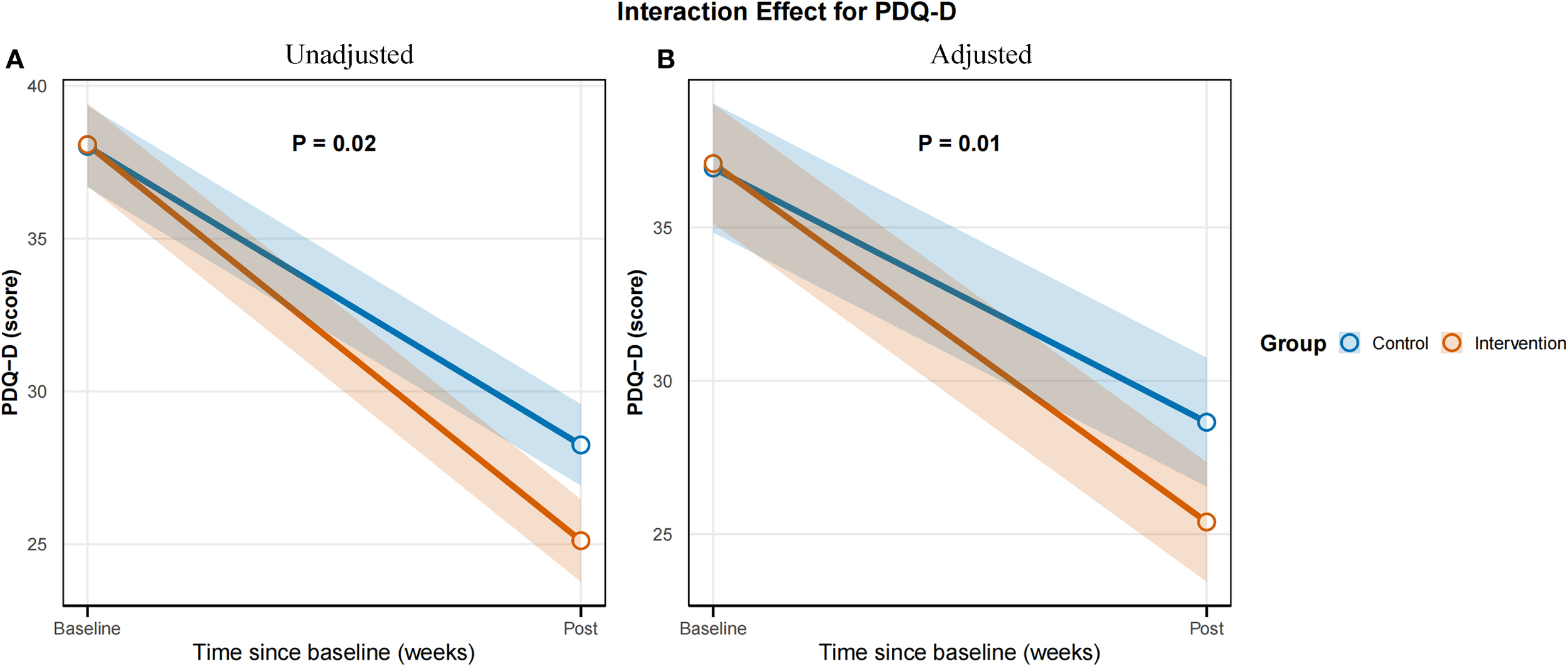 Time × group interaction effect for the primary outcome PDQ-D Scores. (A) Unadjusted model. (B) Adjusted model.