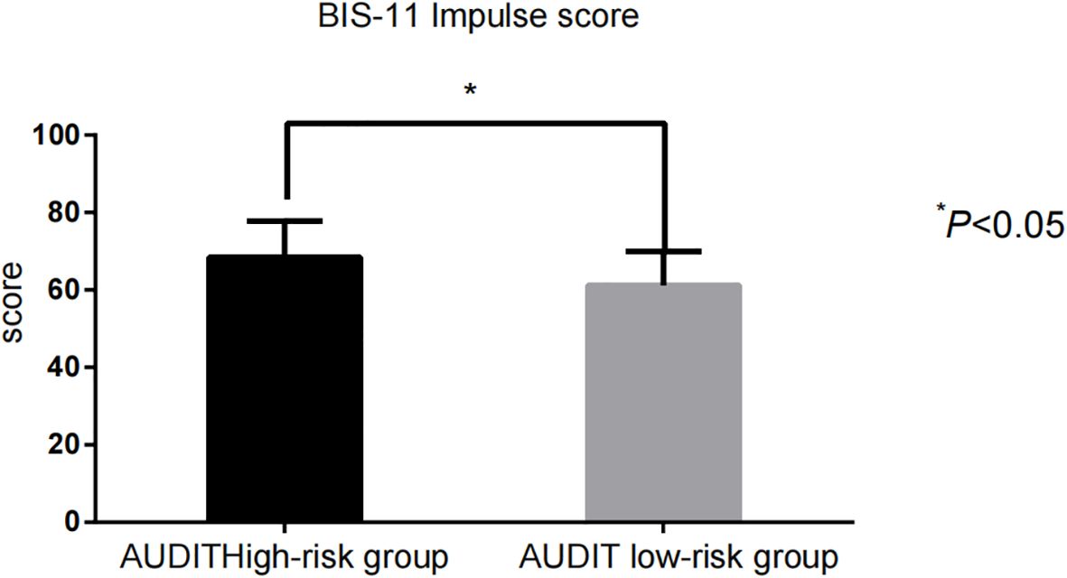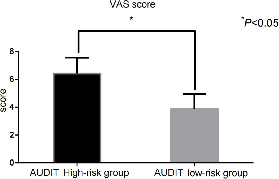 The impulsivity scores [BIS-11: (68.43 ± 9.35) vs. (61.22 ± 8.71)] and addictive behavior scores [VAS: (6.42 ± 1.14) vs. (3.88 ± 1.06)] in the AUDIT high-risk group were significantly higher than those in the low-risk group (P < 0.001) (Figure 1, Figure 2).