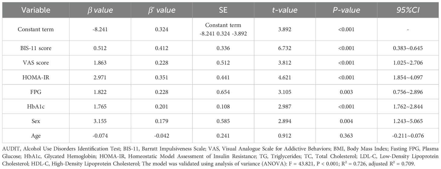 Regarding metabolic indices, this study found that glucose metabolic indices (FPG, HbA1c, and HOMA-IR) were significantly higher in the AUD high-risk group than in the low-risk group and were strongly and positively correlated with AUDIT and VAS scores (r = 0.682–0.716, P < 0.001), suggesting that abnormal glucose metabolism in the postoperative period may be closely related to addictive behaviors. This suggests that abnormal glucose metabolism may enhance sensitivity to alcohol-related reward stimuli by affecting brain insulin signaling, dopamine metabolism, and other pathways, which, in turn, increase the risk of addiction. In addition, abnormal insulin signaling in the nucleus ambiguous, a central neuromodulator, may be involved in the development of addictive behaviors (24, 25). By contrast, lipid metabolism indices (TC, TG, LDL-C, and HDL-C) did not differ significantly between the high- and low-risk groups and were not significantly correlated with AUDIT or VAS scores, suggesting that lipid metabolism does not have a significant effect on addictive behavior. This is because lipid metabolism primarily functions in energy storage and cellular structure maintenance, rather than influencing the central reward pathway (26).