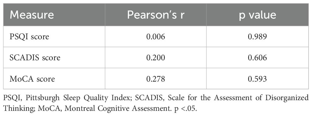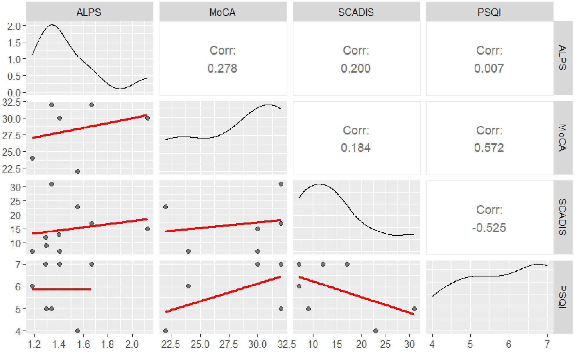 Correlation analyses showed no significant relationships between ALPS index PSQI (r(5) = 0.007, p = 0.989), SCADIS (r(7) = 0.200, p = 0.606), and MoCA (r(4) = 0.278, p = 0.593). The results of correlations between the ALPS Index and psychometric scales are shown in Table 3 and graphically in Figure 1.