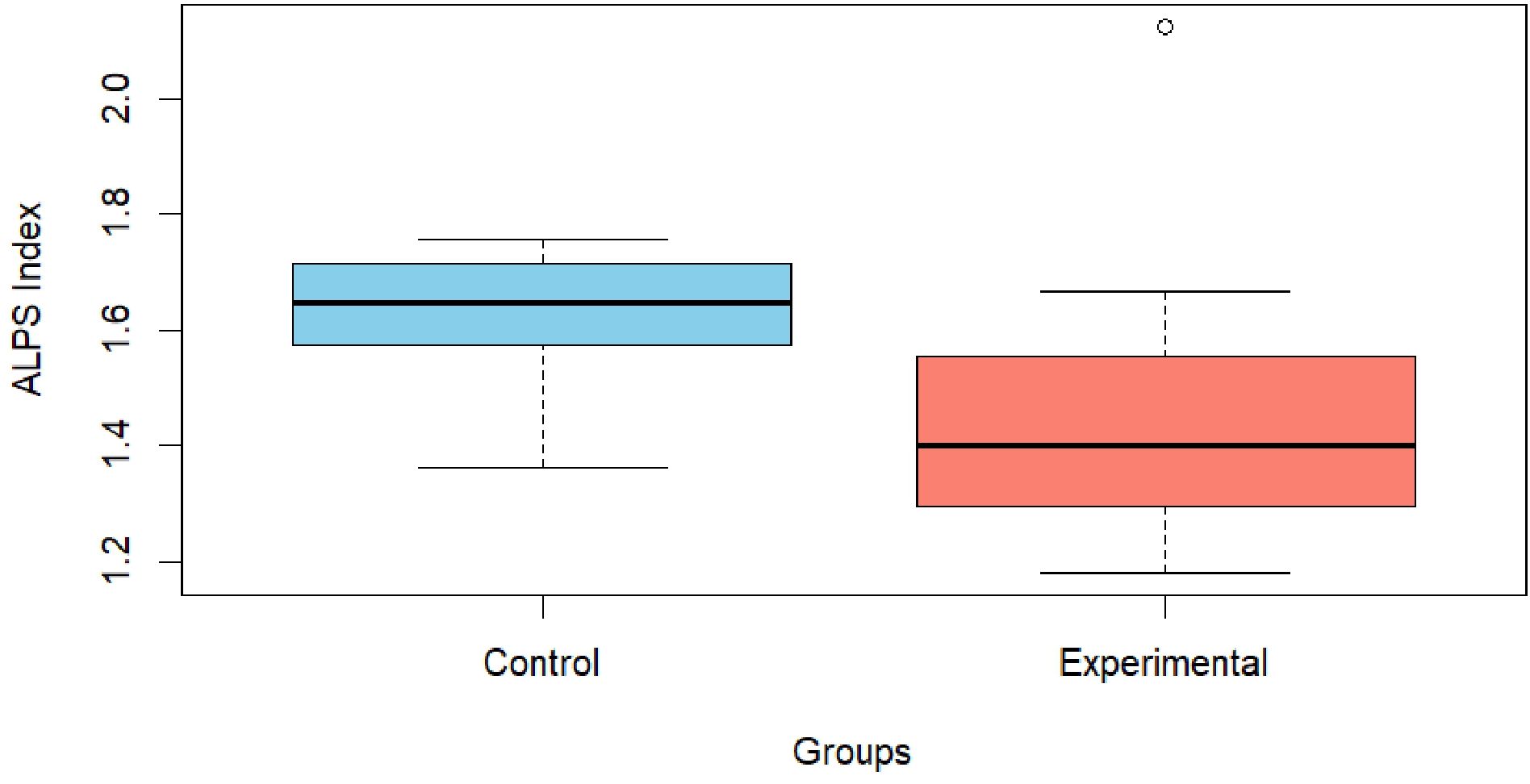 Figure 2. Graphical representation of the ALPS index between the control and experimental groups. The graph illustrates the observed difference between the Control group (skyblue), with a value of 1.63 ± 0.112, and the Experimental group (salmon), which presents a value of 1.47 ± 0.284.