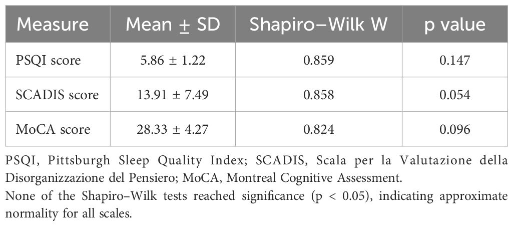 Psychometric assessment was conducted for all participants by trained psychiatrists with specific experience in the administration of standardized clinical tools. The Pittsburgh Sleep Quality Index (PSQI) was used to evaluate subjective sleep quality over the preceding month, with higher scores reflecting poorer sleep (25). To assess the severity of formal thought disorder, clinicians administered the Scala per la Valutazione della Disorganizzazione del Pensiero (SCADIS), a validated Italian-language instrument for quantifying disorganized thinking (26). Finally, global cognitive function was measured through the Montreal Cognitive Assessment (MoCA), which provides a comprehensive overview of executive functioning, memory, attention, language, visuospatial abilities, and orientation (28).