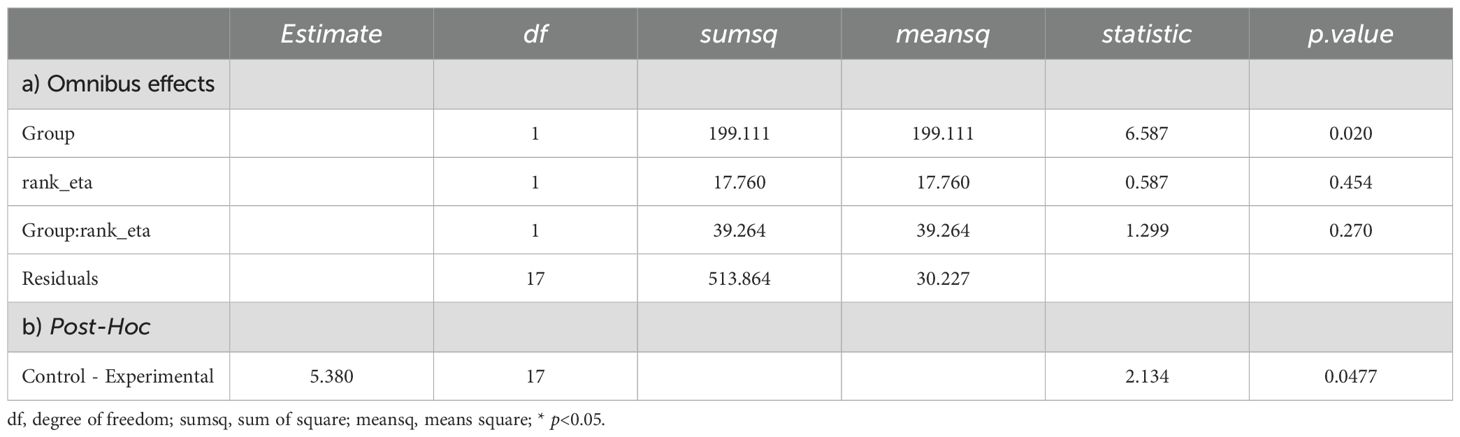 Prior to conducting the ANCOVA, assumptions of normality (Shapiro-Wilk test: W=0.890, p=0.022) and homogeneity of variances (Levene’s test: F(1,19)=4.71, p=0.043) were assessed. Both assumptions were violated. Consequently, a nonparametric ANCOVA was employed (Quade’s test). Results from the nonparametric ANCOVA revealed a significant difference between the two groups (F(1,199)=6.59, p=0.02). This finding was further supported by post-hoc analyses with Bonferroni correction (mean rank difference = 5.38, p=0.047). Specifically, the experimental group had a significantly lower rank than the control group. This corresponded to mean ALPS scores of 1.474 for the experimental group and 1.629 for the control group. Further details are presented in Table 4 and illustrated in Figure 2.