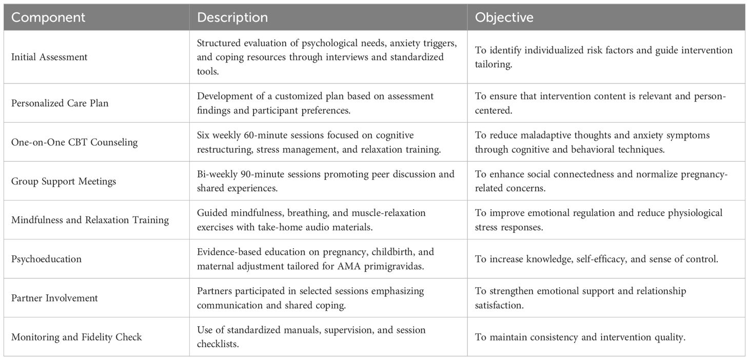 The intervention was conducted over a six-week period, combining individual and group sessions to enhance engagement and skill application. It consisted of several components, each targeting key factors influencing pregnancy-related anxiety identified in Phase I: