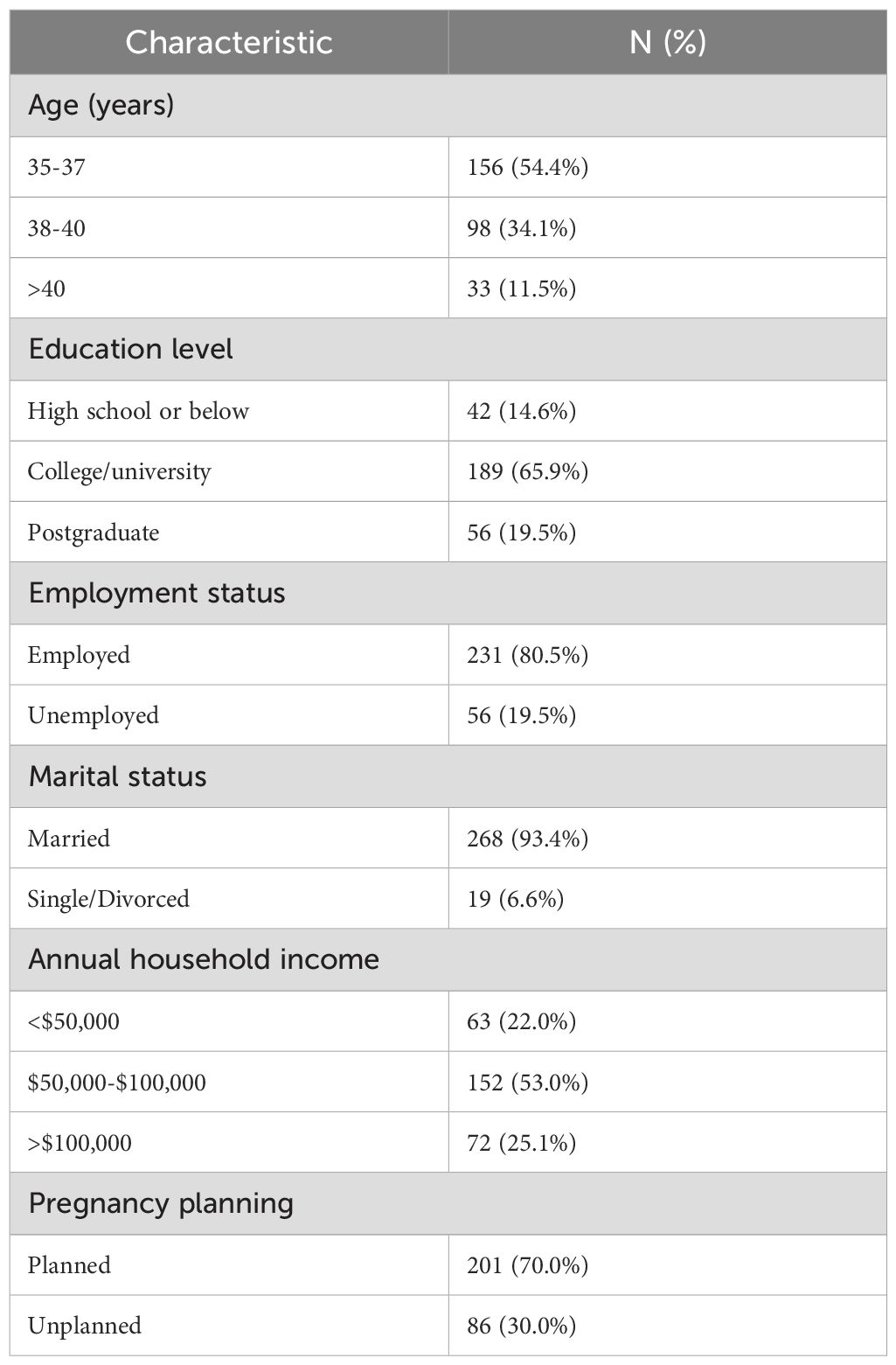 Of the 300 AMA primigravidas approached, 287 completed the survey (response rate: 95.7%), enhancing representativeness and minimizing non-response bias. The mean age of participants was 37.4 ± 2.3 years, consistent with the target AMA primigravidas. Demographic characteristics are presented in Table 2.