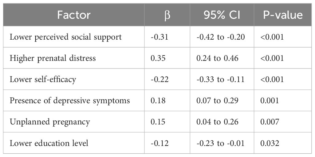 Multiple linear regression (Table 3) identified five independent predictors of pregnancy-related anxiety.
