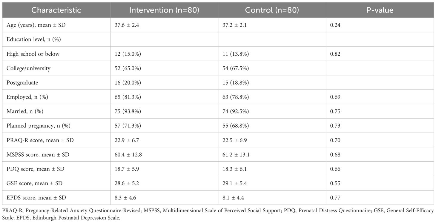 A total of 160 AMA primigravidas were randomized equally to the intervention group (n = 80) and control group (n = 80). Baseline characteristics were comparable between groups (Table 4), confirming successful randomization.