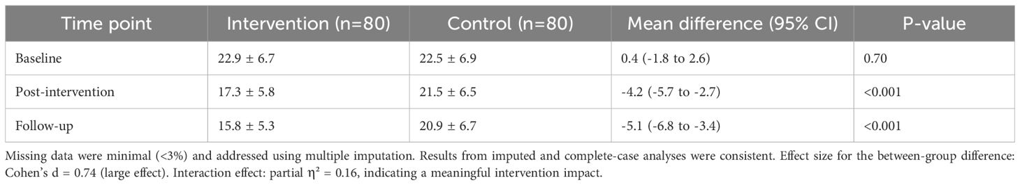 Consistent results were obtained across all imputed datasets, confirming the robustness of findings. The subgroup effect sizes ranged from Cohen’s d = 0.42 (low-anxiety subgroup) to 0.71 (high-anxiety subgroup), both representing moderate-to-large effects, further validating the clinical significance of the intervention.