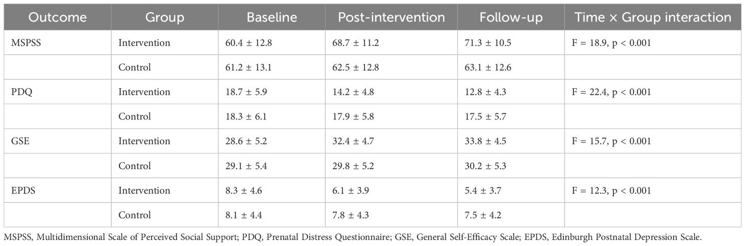 The intervention group exhibited a significantly greater reduction in pregnancy-related anxiety over time compared with controls (F = 28.6, p < 0.001). Between-group differences were significant at both post-intervention and follow-up (Table 5).