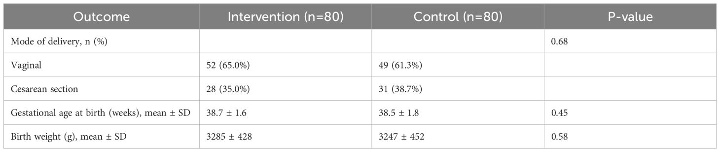 No significant between-group differences were observed in obstetric outcomes (Table 7).