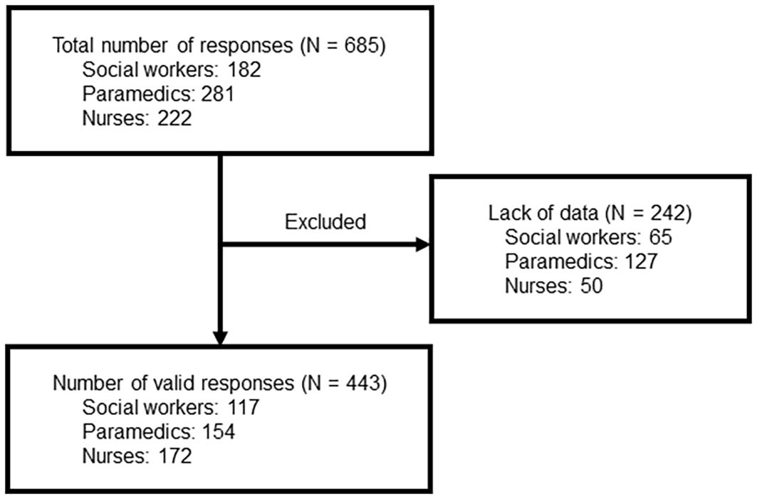 Flowchart showing survey response data. Total responses: 685, with 182 social workers, 281 paramedics, and 222 nurses. Excluded due to lack of data: 242, including 65 social workers, 127 paramedics, and 50 nurses. Valid responses: 443, with 117 social workers, 154 paramedics, and 172 nurses.