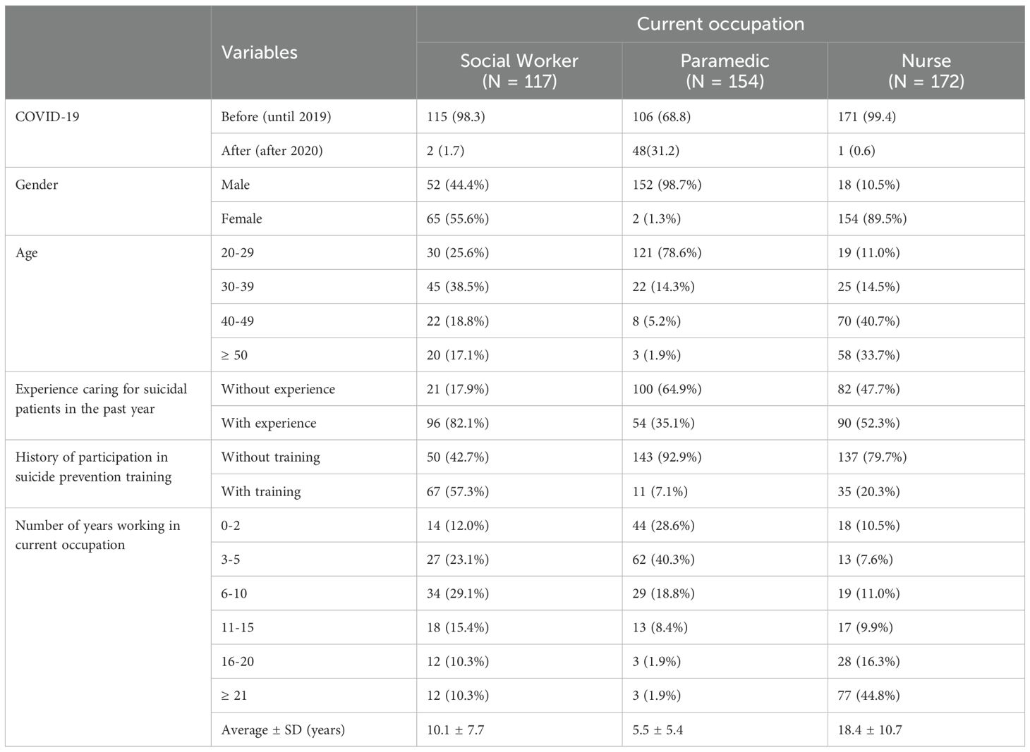 The survey form for the questionnaire asked participants to provide information about their current occupation (social worker, paramedic, nurse), before (until 2019) and after (beyond 2020) the COVID-19 pandemic, gender (male or female), age (four age groups: 20–29 years, 30–39 years, 40–49 years, and over 50 years), presence or absence of experience caring for suicidal patients in the past year (with or without experience), presence or absence of suicide prevention training (with or without training), and the number of years they had been working in their current occupation (per 1 year increase). These variables were determined on the basis of previous studies (14, 17). Although COVID-19 was not adopted as a variable in previous studies, it was adopted as a variable in this study because it affects suicide prevention (25).