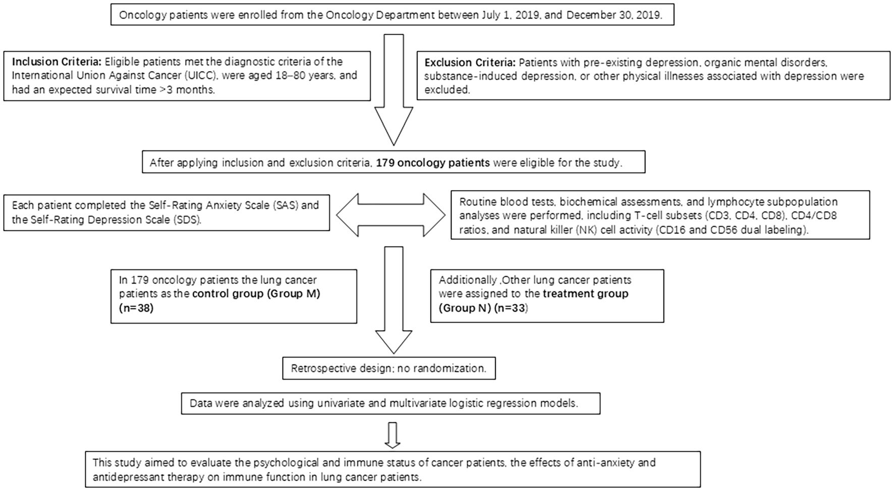 The study included a cohort of 179 patients admitted to the oncology department between July 1, 2019, and December 30, 2019. Upon admission, standard examinations were conducted. Patients completed the SAS and the SDS to assess anxiety and depression symptoms. The examination protocol included routine blood tests, blood biochemistry, and lymphocyte subpopulations analysis (comprising T cell subsets using CD3, CD4, CD8, and CD4/CD8 ratios, along with NK cells using CD16 and CD56 dual labeling) utilizing the Epics-X L flow cytometer manufactured by Coulter in the United States. From the total cohort, 38 lung cancer patients were selected as the control group (designated as Group M).