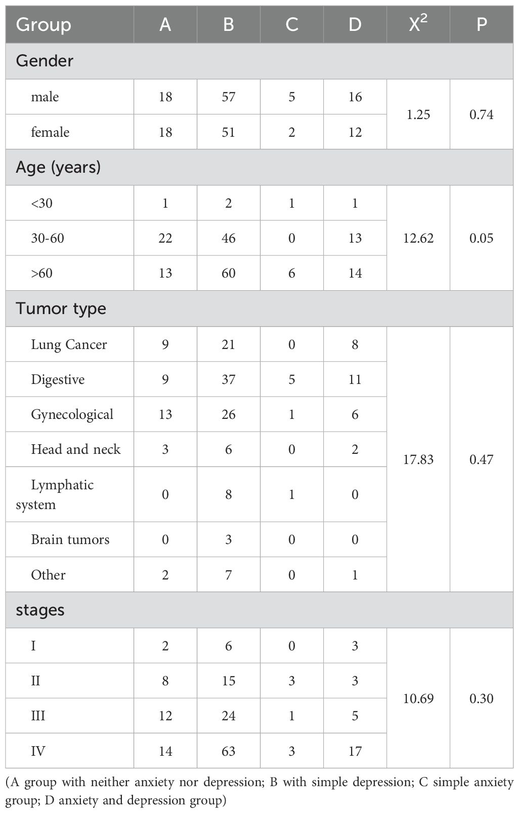 This study (Table 1) analyzed the distribution of anxiety and depression across patient groups categorized by gender, age, tumor type, and cancer stage. Patients were stratified into four distinct groups: Group A (neither anxiety nor depression), Group B (depression only), Group C (anxiety only), and Group D (both anxiety and depression). The gender distribution revealed that among males, Groups A, B, C, and D comprised 18, 57, 5, and 16 patients respectively, while females showed a distribution of 18, 51, 2, and 12 patients across the respective groups (X² = 1.25, P = 0.74). Age analysis indicated the following distribution: patients under 30 years numbered 1, 2, 1, and 1 in Groups A, B, C, and D respectively; those aged 30–60 years numbered 22, 46, 0, and 13; and those over 60 years numbered 13, 60, 6, and 14, respectively (X² = 12.62, P = 0.05). The tumor type distribution showed: lung cancer (9, 21, 0, 8), digestive system cancers (9, 37, 5, 11), gynecological cancers (13, 26, 1, 6), head and neck cancers (3, 6, 0, 2), lymphatic system cancers (0, 8, 1, 0), brain tumors (0, 3, 0, 0), and other types (2, 7, 0, 1) (X² = 17.83, P = 0.47). Cancer stage distribution revealed: stage I (2, 6, 0, 3), stage II (8, 15, 3, 3), stage III (12, 24, 1, 5), and stage IV (14, 63, 3, 17) (X² = 10.69, P = 0.30). This comprehensive analysis elucidates the relationships between anxiety and depression and various patient demographic and clinical parameters.