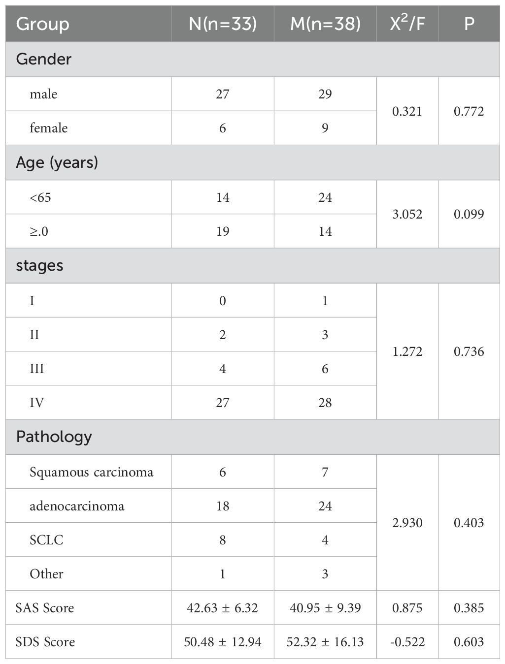 Table 2 presents a comparative analysis of general data between lung cancer patients in the N (treatment group, before drug treatment) group (n=33) and the M (control group) group (n=38). The gender composition comprised 27 males and 6 females in the N group and 29 males and 9 females in the M group, showing no significant difference (X²=0.321, P = 0.772). In terms of age distribution, the N group included 14 patients under 65 and 19 patients aged 65 or older, while the M group had 24 patients under 65 and 14 patients aged 65 or older, with no statistical significance (X²=3.052, P = 0.099). The staging distribution demonstrated no significant differences, with stage IV being predominant in both groups (N: 27, M: 28, X²=1.272, P = 0.736). The pathological types, encompassing squamous carcinoma, adenocarcinoma, SCLC, and others, exhibited no significant differences between groups (X²=2.930, P = 0.403). The mean SAS score was 42.63 ± 6.32 in the N group and 40.95 ± 9.39 in the M group (F = 0.875, P = 0.385). The mean SDS score was 50.48 ± 12.94 in the N group and 52.32 ± 16.13 in the M group (F=-0.522, P = 0.603). These findings indicate no significant differences in general clinical data between the two groups prior to anti-anxiety and depression treatment.