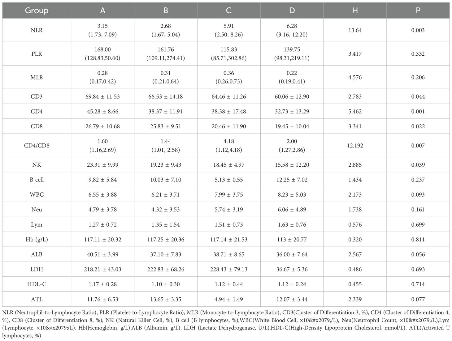 This study (Table 3) investigated the relationship between anxiety and depression and immune function in tumor patients by analyzing four distinct groups: Group A (no anxiety or depression), Group B (depression only), Group C (anxiety only), and Group D (both anxiety and depression). The NLR demonstrated significantly higher values in Group D (6.28 [3.16, 12.20]) compared to other groups (H (Kruskal-Wallis H test) = 13.64, P = 0.003). However, the platelet-to-lymphocyte ratio (PLR) showed no significant differences among groups (H = 3.417, P = 0.332), and similarly, the monocyte-to-lymphocyte ratio (MLR) remained comparable (H = 4.576, P = 0.206). Notable variations emerged in T-cell subsets: levels of CD3 (H = 2.783, P = 0.044), CD4 (H = 5.462, P = 0.001), and CD8 (H = 3.341, P = 0.022) were reduced in Group D, while the CD4/CD8 ratio exhibited significant variation across groups (H = 12.192, P = 0.007). Furthermore, NK cell counts were markedly lower in Group D (H = 2.885, P = 0.039). The analysis revealed no significant differences among groups in B cells (H = 1.434, P = 0.237), white blood cells (WBC) (H = 2.173, P = 0.093), Neu (H = 1.738, P = 0.161), Lym (H = 0.576, P = 0.699), hemoglobin (Hb) (H = 0.320, P = 0.811), albumin (ALB) (H = 2.567, P = 0.056), lactate dehydrogenase (LDH) (H = 0.486, P = 0.693), high-density lipoprotein cholesterol (HDL-C) (H = 0.455, P = 0.714), or Activated T lymphocytes(ATL) (H = 2.339, P = 0.077). These results suggest a significant association between anxiety and depression and altered immune function in tumor patients.