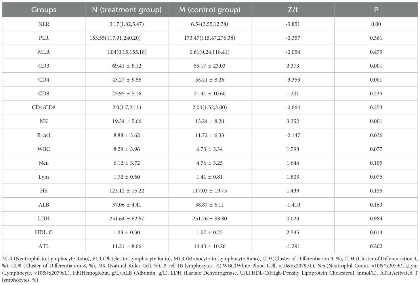 Table 4 presents a comparative analysis of immune function parameters between the N group (treatment group receiving anti-anxiety and depression therapy) and the M group (control group) in tumor patients. The NLR showed significantly lower levels in the treatment group (3.17 [1.82, 5.47]) compared to the control group (6.54 [3.55, 12.78]; Z=-3.851, P = 0.00). No significant differences were observed in PLR and MLR values between the groups. The treatment group demonstrated significantly elevated CD3 levels (69.41 ± 8.12) compared to the control group (55.17 ± 23.03; t=3.373, P = 0.001). Similarly, CD4 levels were significantly higher in the treatment group (43.27 ± 9.56) versus the control group (35.41 ± 8.26; t=-3.353, P = 0.001). CD8 levels and CD4/CD8 ratios remained comparable between groups. NK cell levels were significantly elevated in the treatment group (19.34 ± 5.66) compared to the control group (13.24 ± 8.20; t=3.352, P = 0.001). Conversely, B cell levels were significantly lower in the treatment group (8.88 ± 3.68) compared to the control group (11.72 ± 6.33; t=-2.147, P = 0.036). The analysis revealed no significant differences in WBC, Nc, Lc, HB, ALB, LDH, or ATL between groups. HDL-C levels were significantly higher in the treatment group (1.23 ± 0.30) compared to the control group (1.07 ± 0.25; t=2.535, P = 0.014). These results indicate that anti-anxiety and depression therapy was associated with alterations in specific immune function parameters.