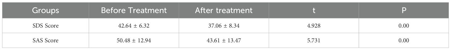 The analysis compared SDS and SAS scores of 33 lung cancer patients in Group N before and after anti-anxiety and depression treatment. The SDS score demonstrated a significant decrease from 42.64 ± 6.32 before treatment to 37.06 ± 8.34 after treatment, yielding a t-value of 4.928 and a P-value of 0.00. The SAS score exhibited a similar significant reduction from 50.48 ± 12.94 before treatment to 43.61 ± 13.47 after treatment, with a t-value of 5.731 and a P-value of 0.00. These findings indicate that the anti-anxiety and depression treatment correlated with decreased SDS and SAS scores among the study participants (Table 5).