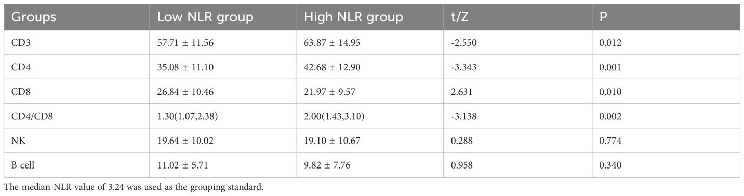 Table 6 presents a comparative analysis of immune function parameters among 179 patients with anxiety and depression tumors, categorized according to NLR levels. The analysis revealed that CD3 levels were notably lower in the low NLR group (57.71 ± 11.56) compared to the high NLR group (63.87 ± 14.95), demonstrating statistical significance (t = -2.550, P = 0.012). CD4 levels exhibited a similar pattern, with significantly lower values in the low NLR group (35.08 ± 11.10) compared to the high NLR group (42.68 ± 12.90), (t = -3.343, P = 0.001). Conversely, CD8 levels were significantly elevated in the low NLR group (26.84 ± 10.46) compared to the high NLR group (21.97 ± 9.57), (t = 2.631, P = 0.010). The CD4/CD8 ratio showed significantly lower values in the low NLR group (1.30 [1.07, 2.38]) compared to the high NLR group (2.00 [1.43, 3.10]), (Z = -3.138, P = 0.002). NK cell and B cell levels showed no significant differences between the groups. The study utilized a median NLR value of 3.24 as the grouping criterion.