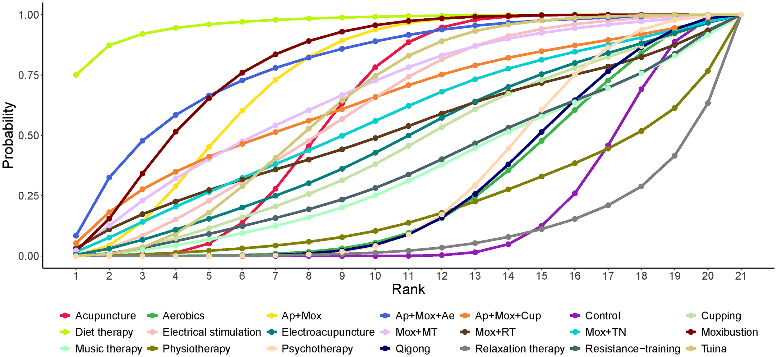 In our results, Ap, Mox, Tuina, diet therapy, electrical stimulation, Ap + Mox, and Ap + Mox + Ae significantly reduced depression scores in CFS patients compared to the control intervention, demonstrating reliable efficacy in treating depression.