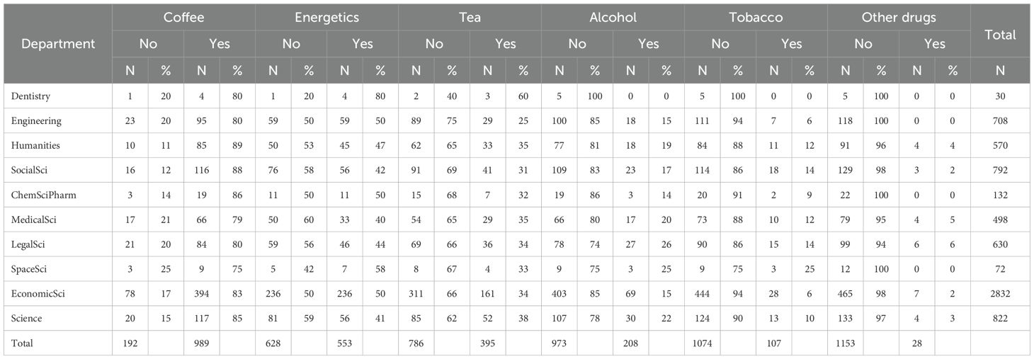 A total of 1,181 participants were obtained reach, with 989 (83.7%) declaring coffee consuming 553 (46.8%) energy drinks, and 395 (33.4%) tea. Regarding alcohol consumption, 208 (17.6%) participants consumed alcohol, 107 (9.1%) used tobacco, and 28 (2.4%) used other drugs. Regarding faculties and consumption, the Faculty of Humanities and Arts reported the highest coffee consumption at 85 (89.5%), followed by energy drinks and tea, with the Faculty of Dentistry reporting 4 (80%) and 3 (60%) respectively. Alcohol consumption was 27 (25.7%) and drug consumption 6 (5.7%) was concentrated in the Faculty of Law, while tobacco consumption was highest in the Faculty of Space Sciences with 3 (25%). The results are presented in Table 1.