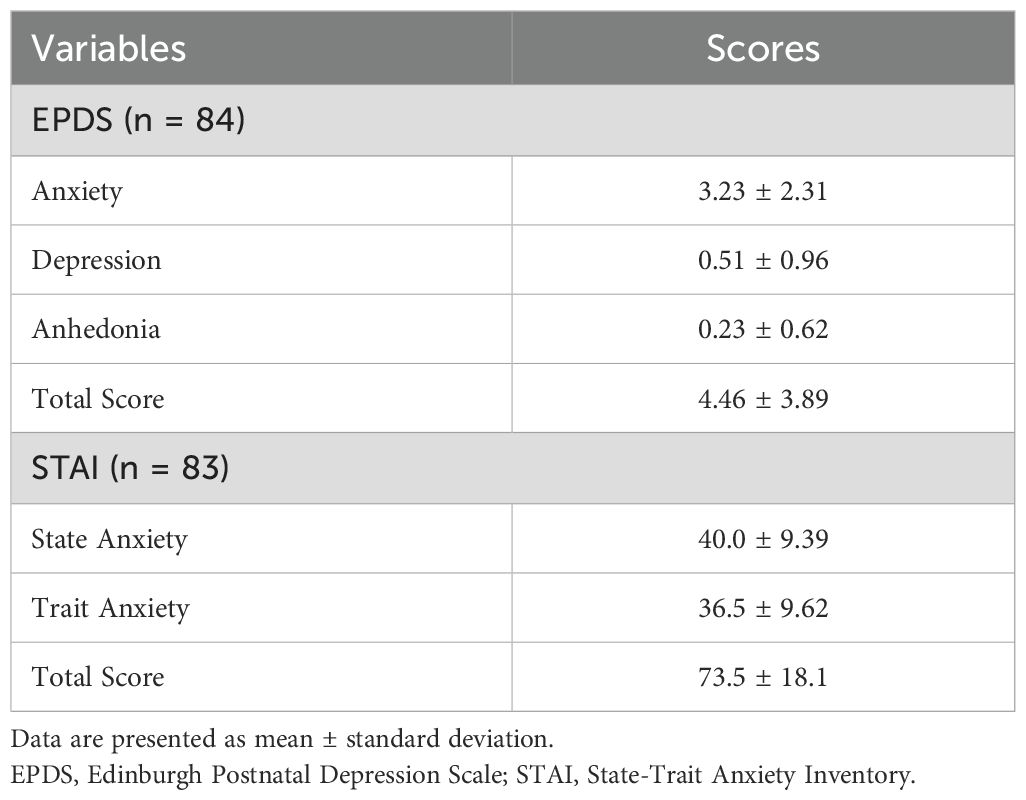 Descriptive statistics, including means and standard deviations, were calculated for each factor of the EPDS and STAI scores.