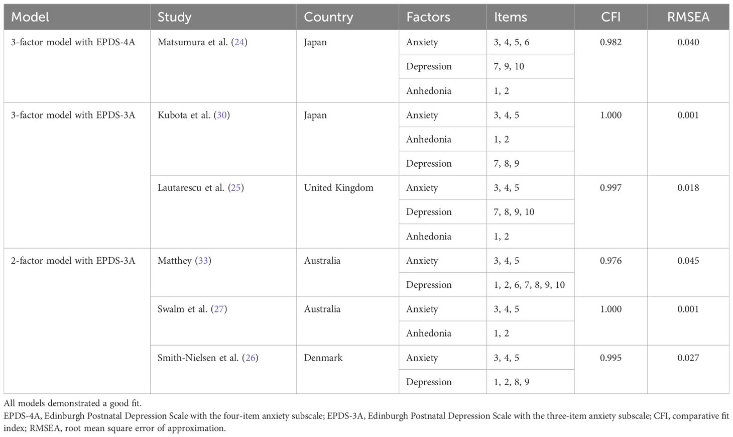 We also conducted CFA to compare the factor models proposed in six previous studies (Table 2). The results indicated that all models demonstrated good fit to the data: the three-factor models with EPDS-3A from Kubota et al. (30) and Lautarescu et al. (25) with CFI = 1.000 and 0.997, RMSEA = 0.001 and 0.018, respectively; and the two-factor models with EPDS-3A from Matthey (33), Swalm et al. (27), and Smith-Nielsen et al. (26) with CFI = 0.976, 1.000, and 0.995, RMSEA = 0.045, 0.001, and 0.027, respectively. Among these, the EPDS-3A with three-factor (30) and the two-factor models (27) provided the best fit to our data.