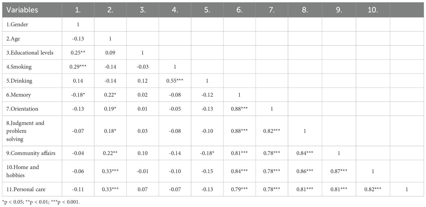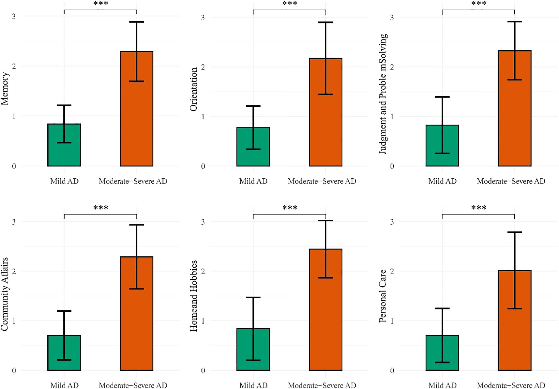 Significant differences were observed across all six domains of the CDR between the mAD and mod-sAD groups (Figure 1). The Mod-sAD group showed significantly higher impairment scores, compared to the mAD group, across all cognitive and functional domains (all p < 0.001). Cohen’s d values indicated large effect sizes across all domains, with Home and Hobbies showing the largest effect size (Cohen’s d = 2.71), followed by Memory (Cohen’s d = 2.67), Community Affairs (Cohen’s d = 2.61), and Judgment and Problem Solving (Cohen’s d = 2.58). Orientation (Cohen’s d = 2.12) and Personal Care (Cohen’s d = 1.83). Correlation analysis revealed significant relationship between demographic variables and CDR domain scores (presented in Table 2). Gender was negatively correlated with memory impairment (r = –0.18, p < 0.05). Age was positively correlated with all functional domains, including memory (r = 0.22, p < 0.05), orientation (r = 0.19, p < 0.05), judgment and problem solving (r = 0.18, p < 0.05), community affairs (r = 0.22, p < 0.01), home and hobbies (r = 0.33, p < 0.001), and personal care (r = 0.33, p < 0.001).