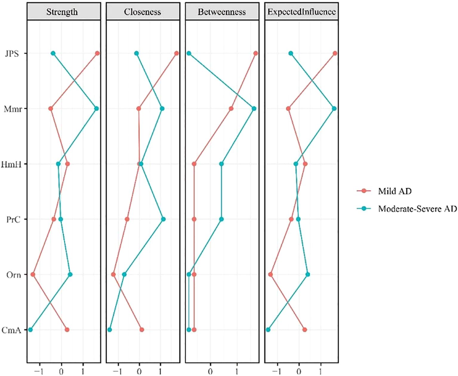 Symptom networks were constructed using regularized partial correlation networks through the R package “qgraph” (19). Regularization was applied using the Extended Bayesian Information Criterion (EBIC) with a hyperparameter γ = 0.5 to balance model complexity and sparsity. Separate networks were estimated for the mAD and Mod-sAD groups to examine structural differences between disease stages. Network comparison was performed using the Network Comparison Test (NCT) implemented in the “NetworkComparisonTest” package (20). Global strength differences between networks were tested using permutation-based methods with 1000 iterations. Network subtraction was employed to identify edges that differed between groups, highlighting connections that emerged or strengthened in the moderate-to-severe stage. Centrality indices were calculated for each node within both networks, including strength centrality (sum of absolute edge weights connected to a node), closeness centrality (inverse of the sum of shortest path lengths to all other nodes), and betweenness centrality (frequency with which a node lies on the shortest path between other nodes). Centrality measures were standardized (z-scores) to facilitate comparison between groups and identify nodes with particularly high or low centrality values.