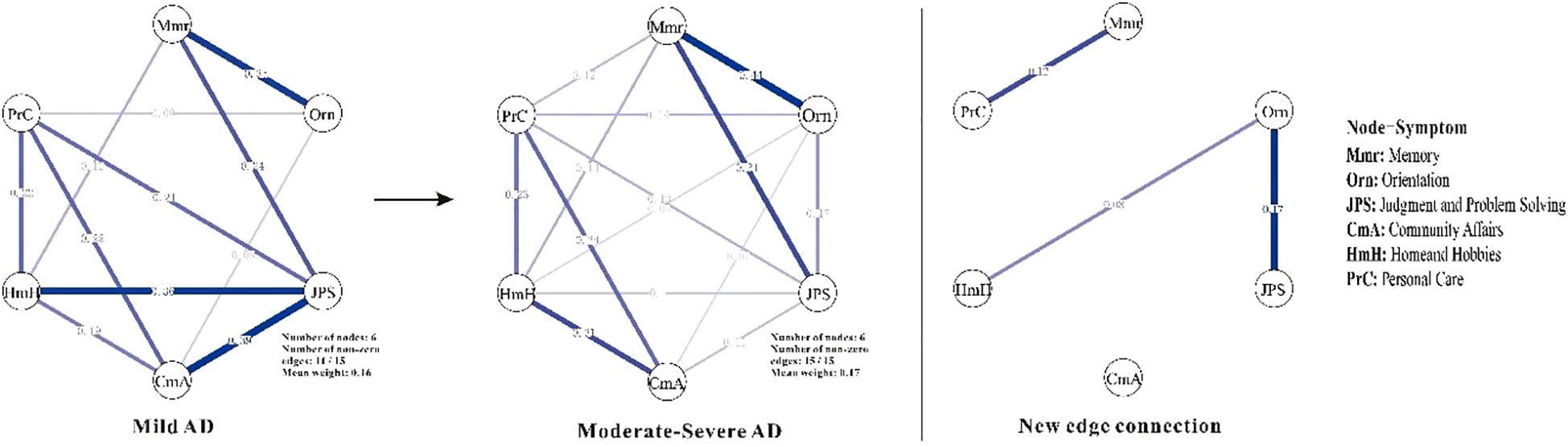 This study utilized network analysis to examine the network structure based on CDR domains based on CDR domains in individuals with mild and moderate-to-severe Alzheimer’s disease, offering novel insights into the dynamic interplay of symptoms across the course of disease progression. The findings reveal alterations in symptom network structures that closely parallel the clinical trajectory of AD as it advances from mild to more severe stages.