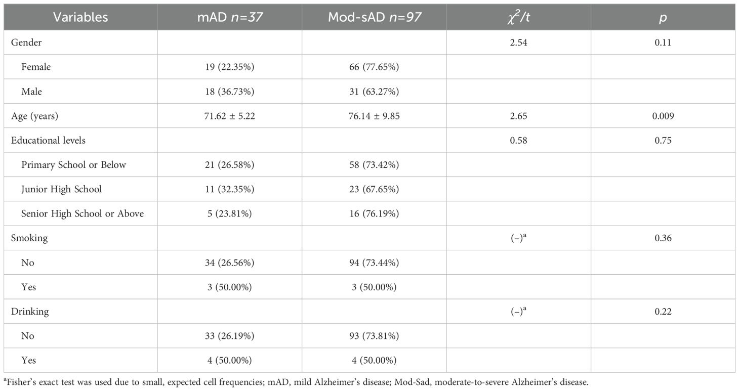 A total of 134 participants diagnosed with Alzheimer’s disease were included in the final analysis, comprising 37 patients with mAD and 97 patients with Mod-sAD. The demographic characteristics of the participants were presented in Table 1. The two groups were well-matched across most demographic variables, with no significant differences observed in gender distribution (p = 0.11), educational levels (p = 0.75), smoking status (p = 0.36), or drinking habits (p = 0.22). However, patients in the Mod-sAD group were significantly older than those in the mAD group (p = 0.009).