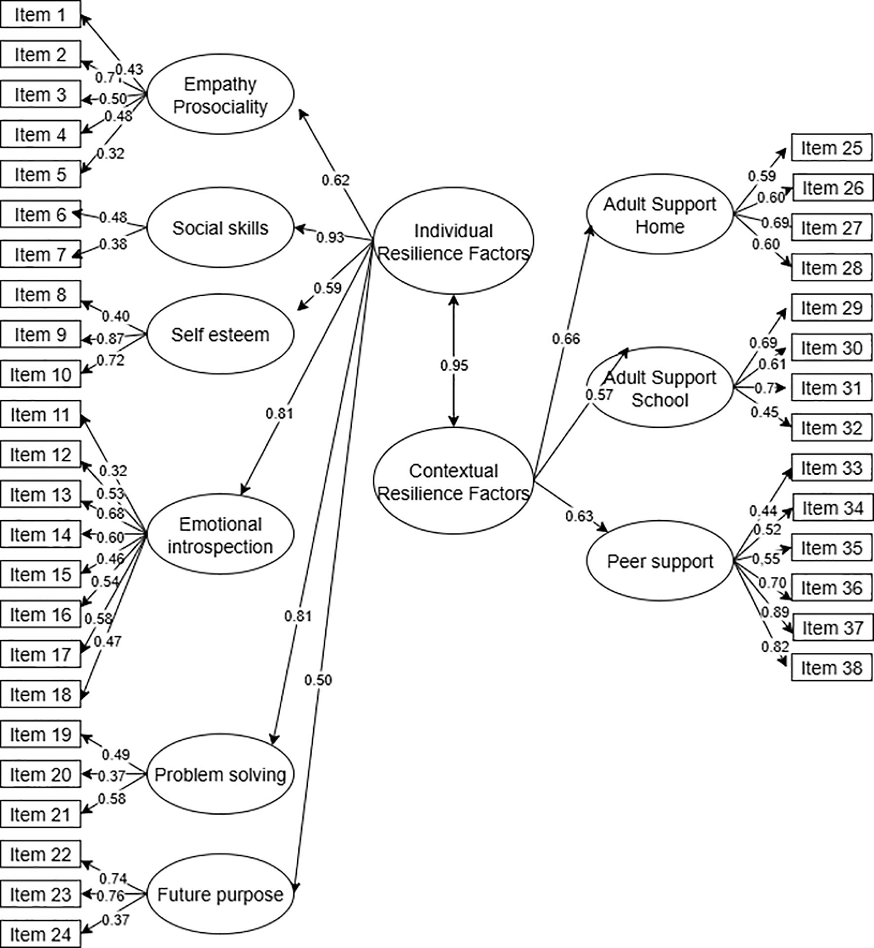 As part of the CFA results, all standardized factor loadings were also examined to evaluate the adequacy of the measurement model. RES-PRIM assesses both individual resilient factors (Empathy/prosociality, Social skills, Self-esteem, Emotional introspection, Problem-solving, and Future purpose) and contextual resilient factors (Adult support at home, Adult support at school, and Peer support). Standardized factor loadings for all items are reported in Figure 4, and all met or exceeded the recommended minimum of.30 (59, 60), with most falling in the moderate to high range, thus supporting the adequacy of the items as indicators of their respective factors. Although some dimensions presented comparatively lower loadings (e.g., Future Purpose and Self-esteem), these values are still above the conventional acceptability threshold and were theoretically justified as core dimensions of resilience in childhood. Therefore, they were retained in the final model to preserve the conceptual integrity of the construct.