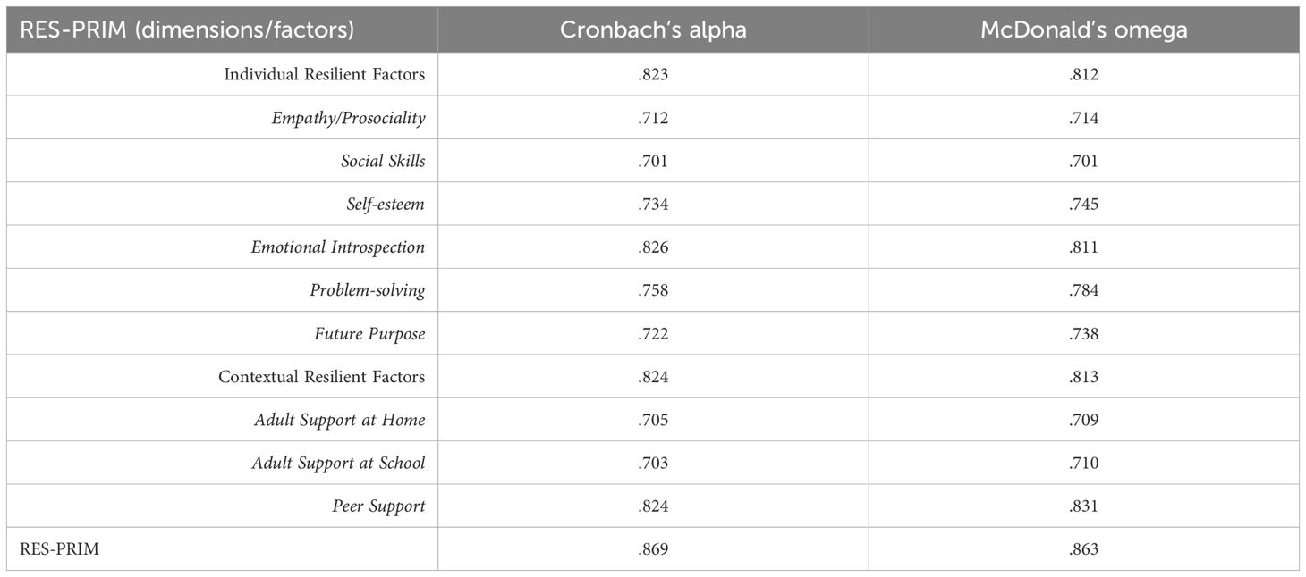 The reliability of the scale was analyzed using Cronbach’s alpha and McDonald’s omega coefficients. The values obtained for RES-PRIM and each of its dimensions are presented in Table 4. As observed, all individual and contextual factors, as well as the overall scale, exhibit satisfactory internal consistency, with values exceeding.70 in most cases.